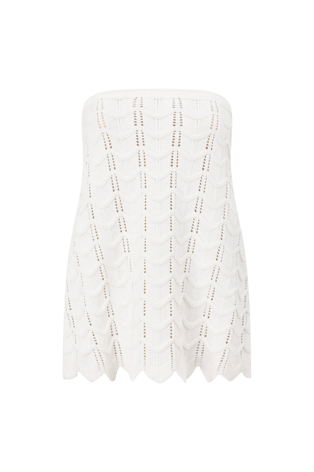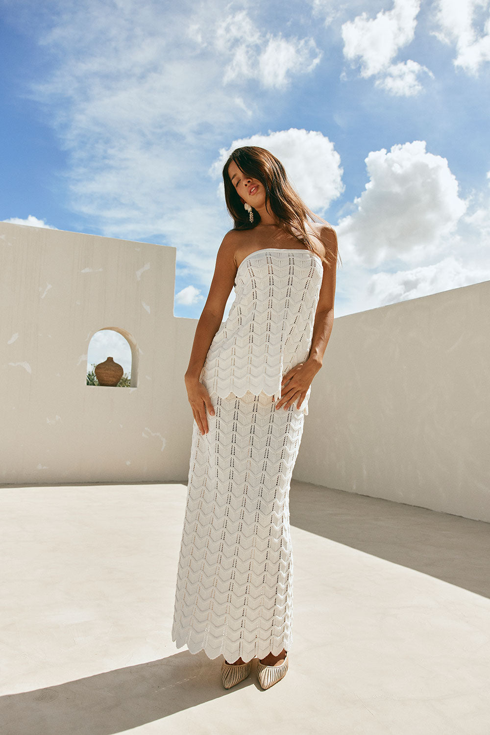 The ultra chic Kimmy Top is made from a high quality cotton jacquard knit in white. It features a strapless neckline with bind finish, longline wavy hem and textured wavy self stripe throughout. Pair with the Kimmy Skirt and Dia Heels. Designed exclusively by Sabo.