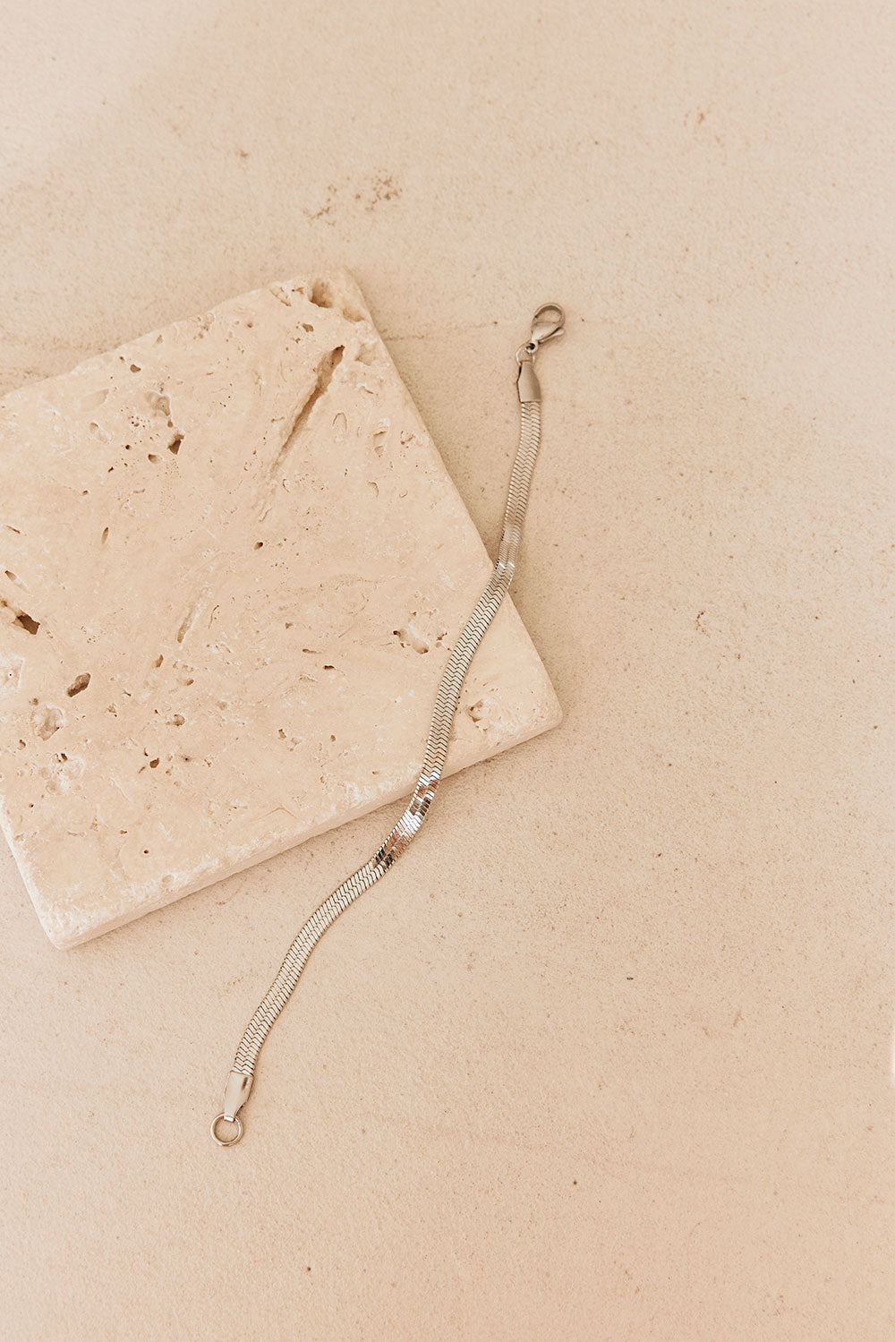 A chic way to accessorise, the Klara Herringbone Bracelet is silver toned and features a flat chain and clasp closure. Pair with the Eve Huggie Earrings!