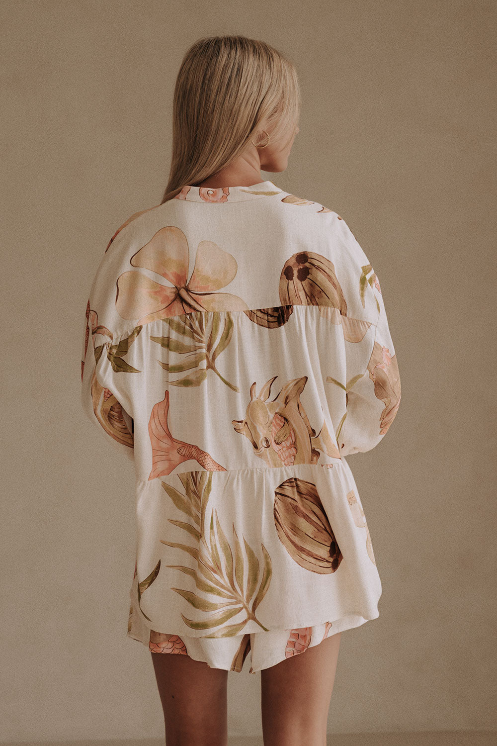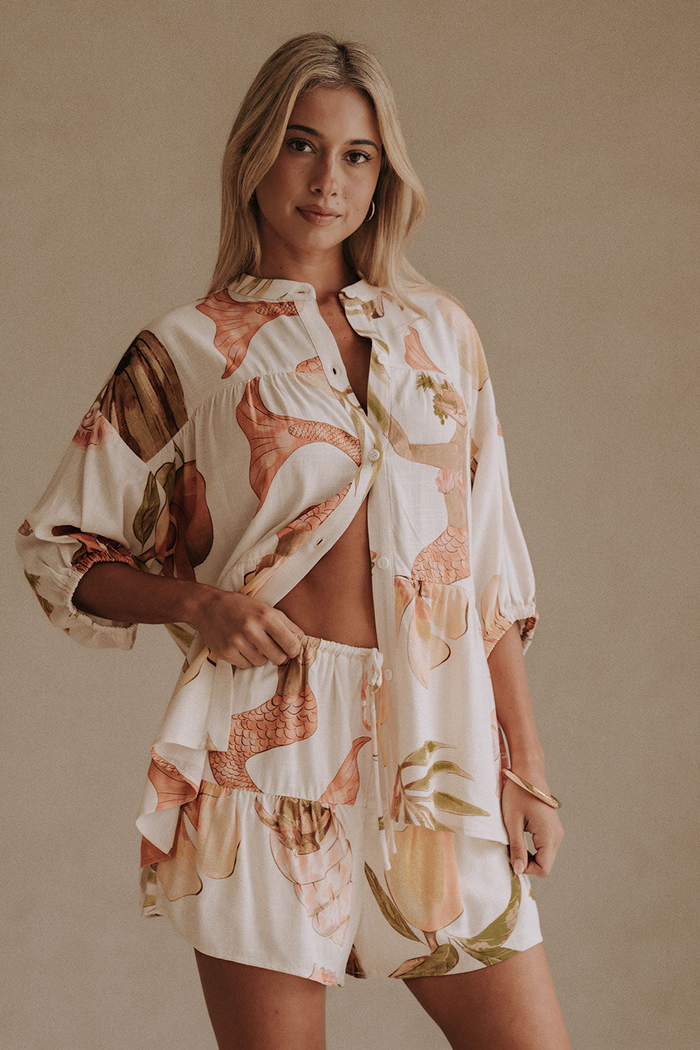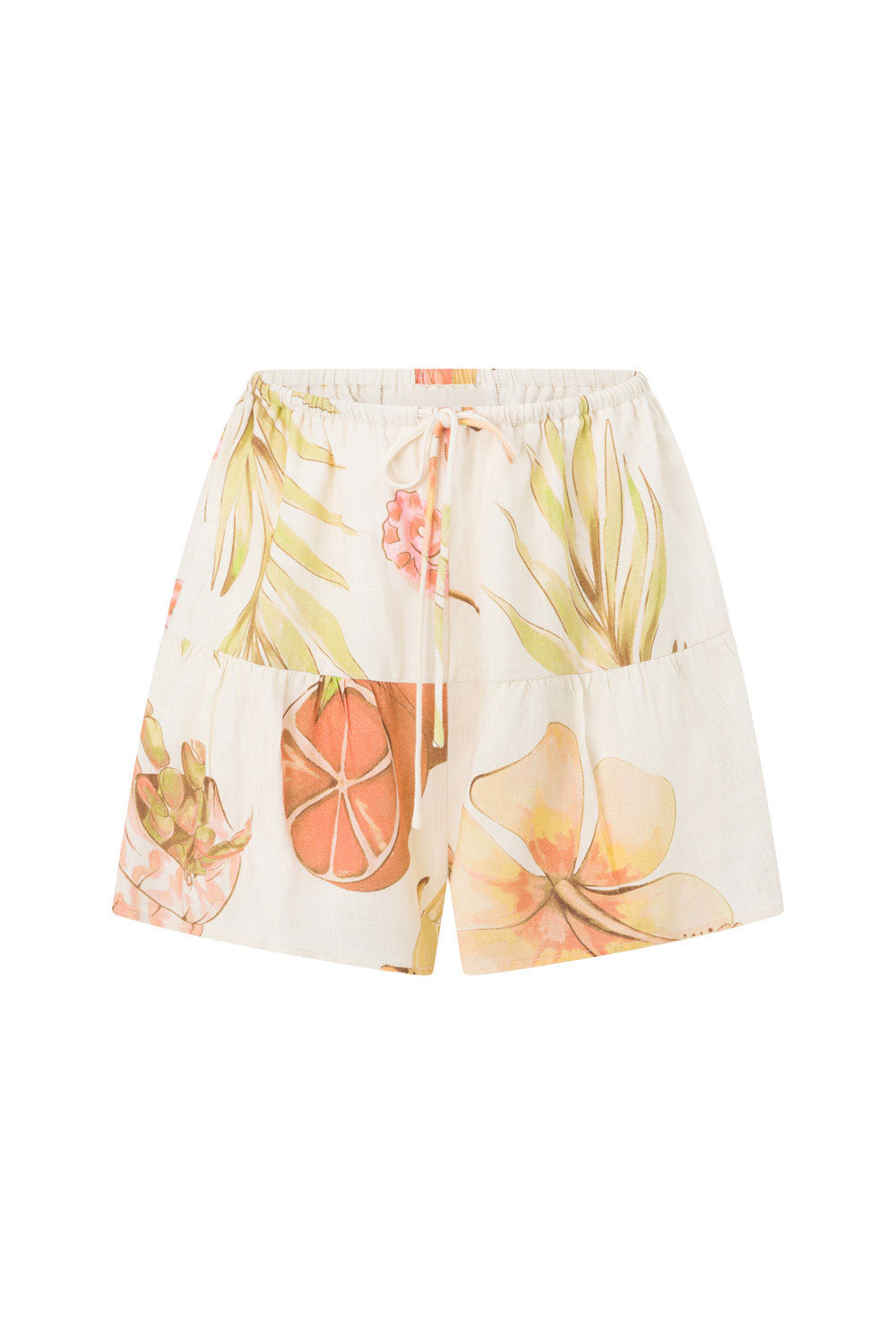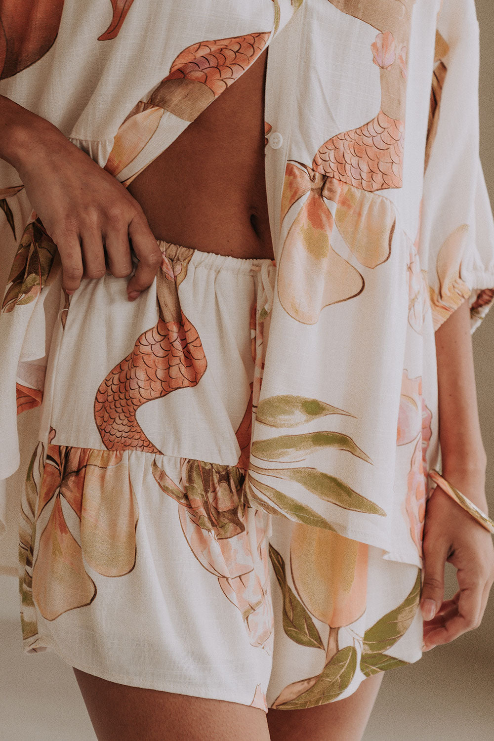 The perfect set to throw over your bikinis and head straight to lunch in! The Lani Shorts are made from a high quality viscose linen blend fabric with our exclusive Island Time print. They are a high waisted style featuring a thin elastic waist with drawstring, gathered flouncy panel and high-low hems. Get the look with the Lani Top! Designed exclusively by Sabo.
