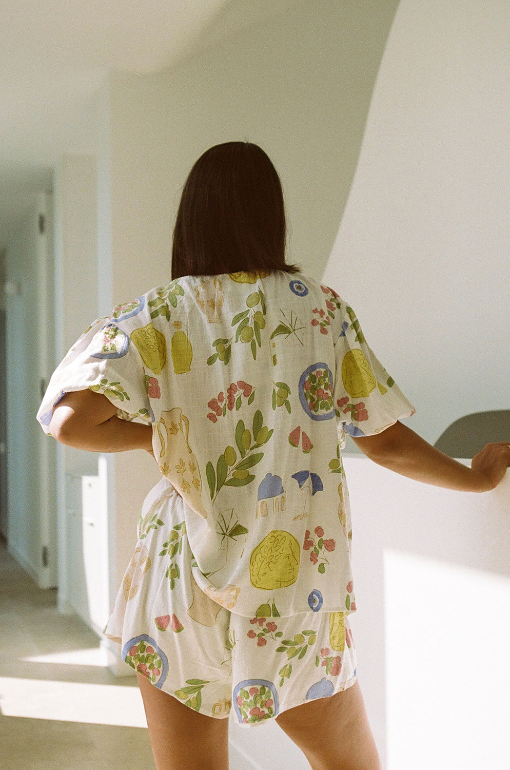 We are swooning over our exclusive new print! The Leta Shorts are made from a luxurious textured viscose linen blend fabric with our exclusive Greece print. They are a high waisted style featuring an elasticated waist with drawstring and curved high-low hems. Get the look with the Leta Top and Rhodes bikini set for the perfect summer outfit! Designed exclusively by Sabo.