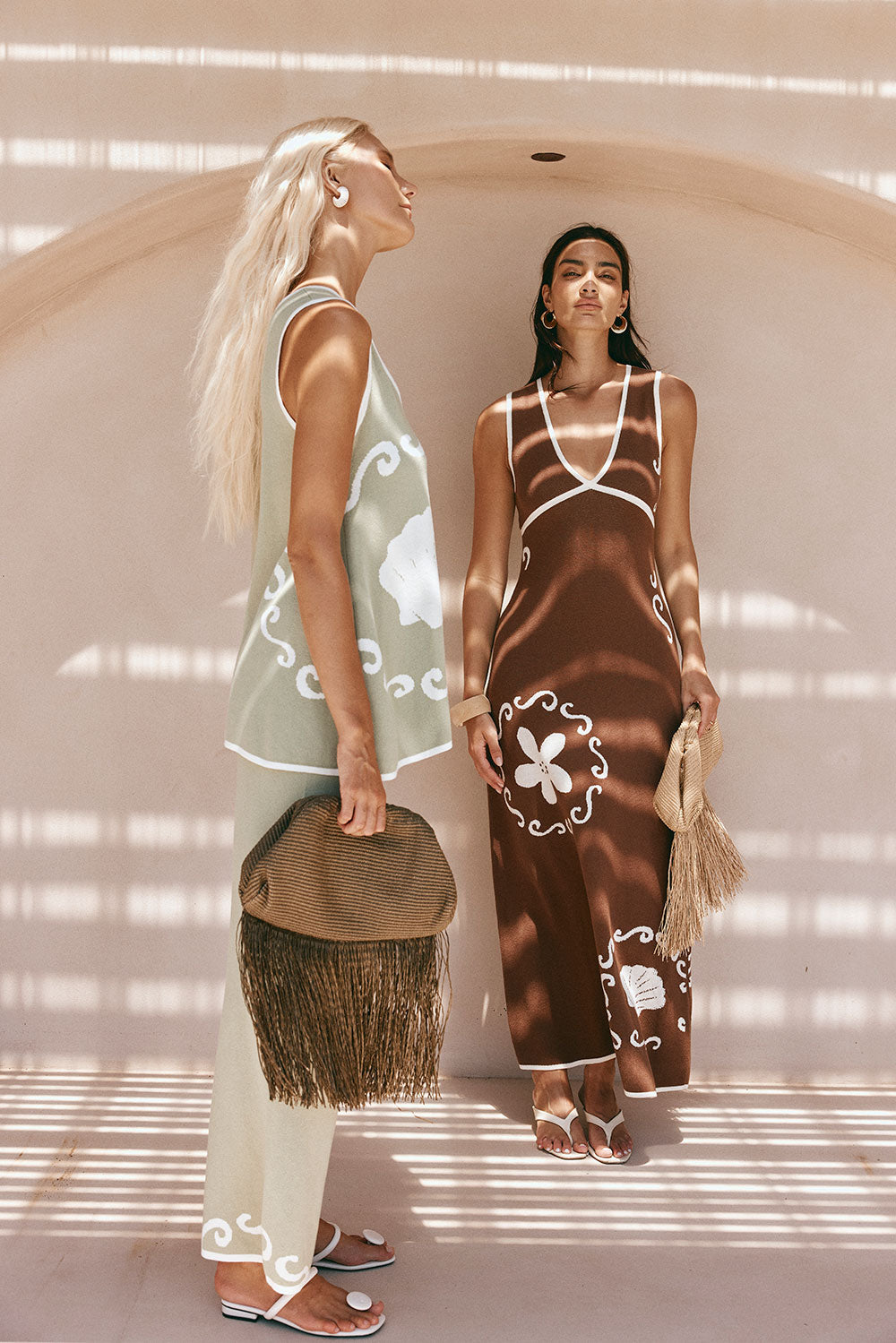 Our retro inspired Malani Pants are made from a natural cotton knit with our exclusive Ocean Relic print intarsia knitted throughout. They are a high waisted style featuring an elasticated waist, relaxed fit and contrast white bind trims. Get the set with the Malani Top! Designed exclusively by Sabo.