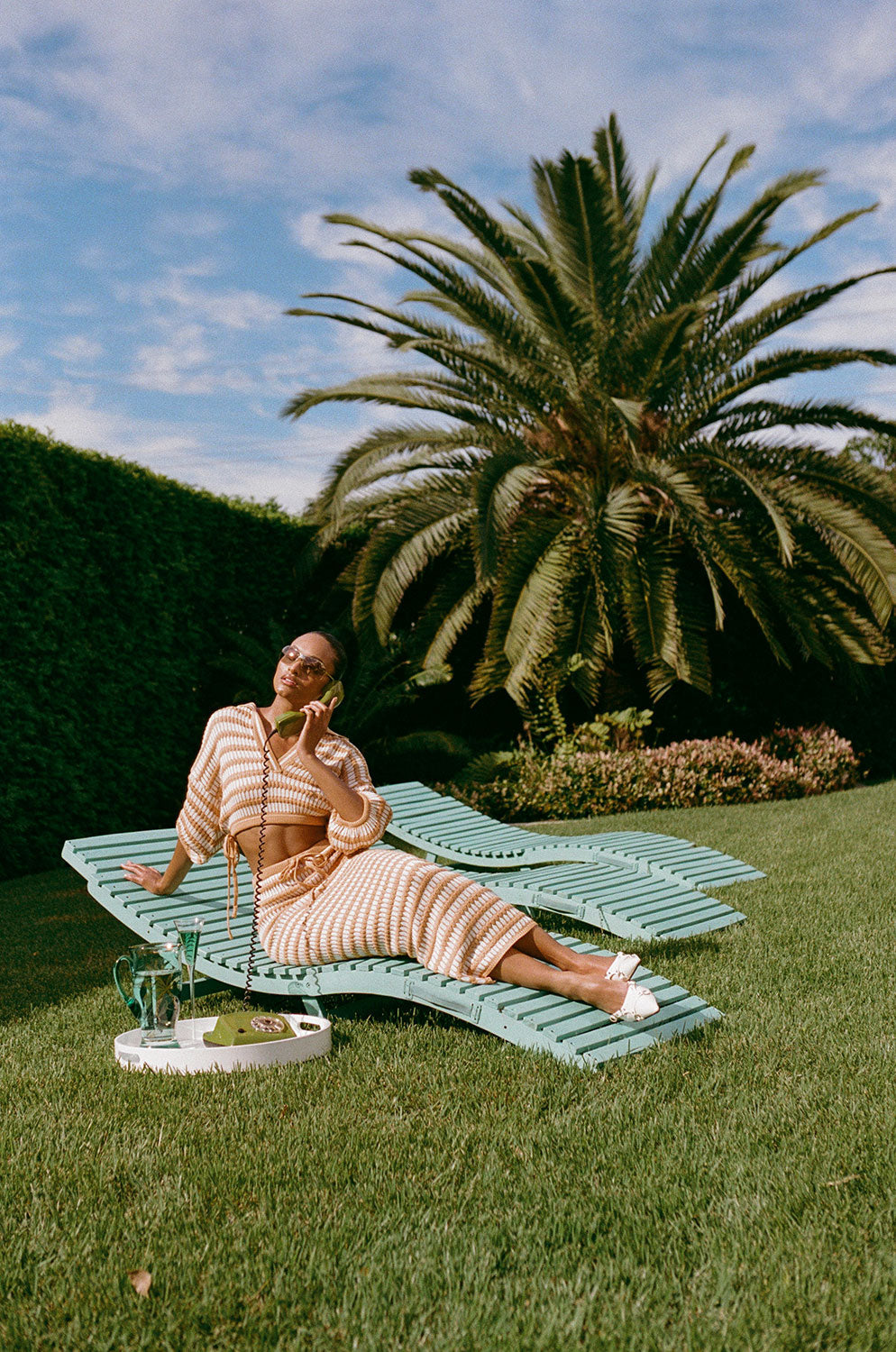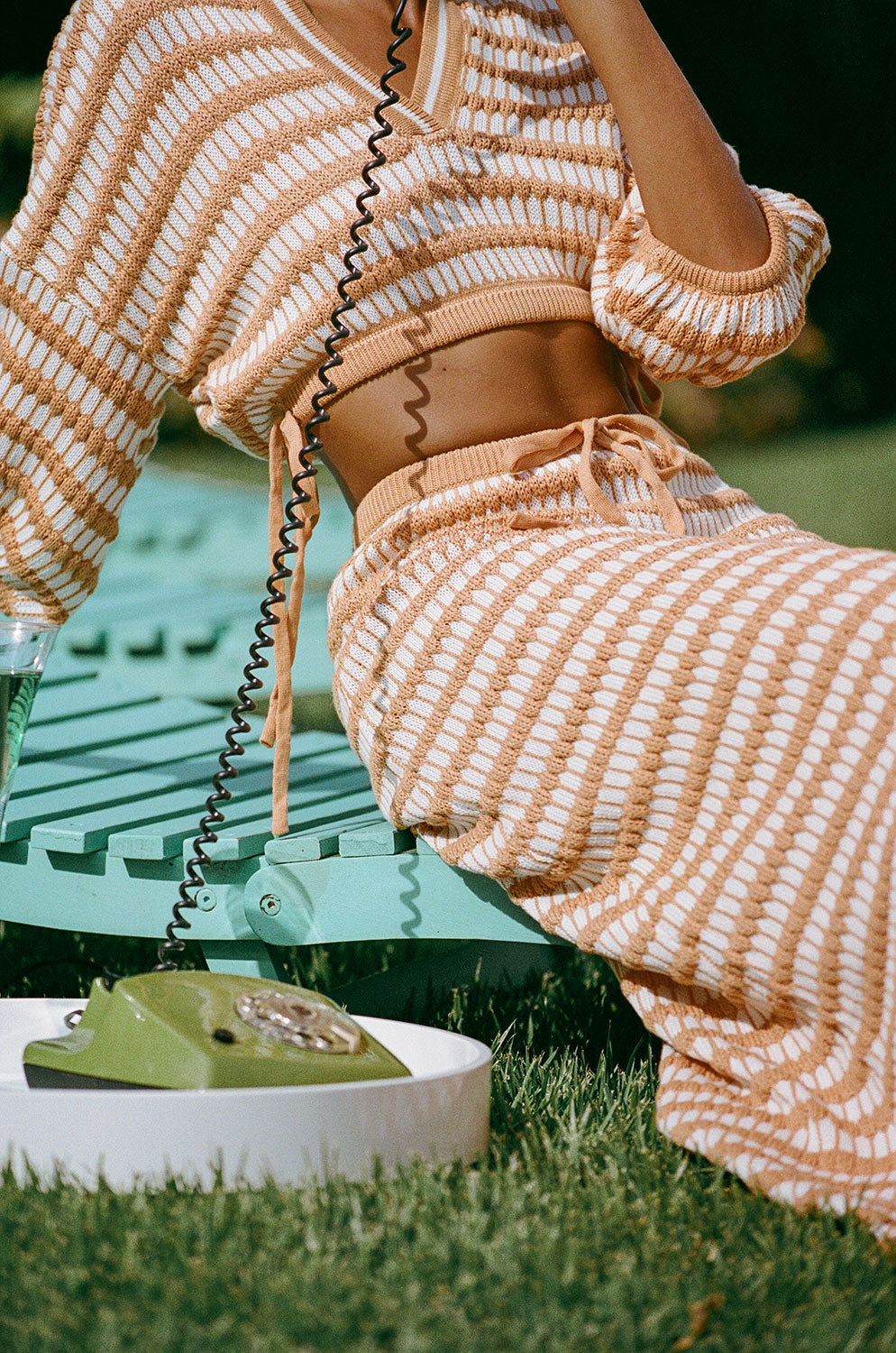 The vintage inspired Mati Knit Top is made from an off white knit fabric with contrast textured tan stripes throughout. It is a semi relaxed style featuring drop shoulders, short sleeves, V neckline, collar and cropped hem with ties at sides. Dress it up and pair with the Mati Knit Skirt or style with jeans. Designed exclusively by Sabo.