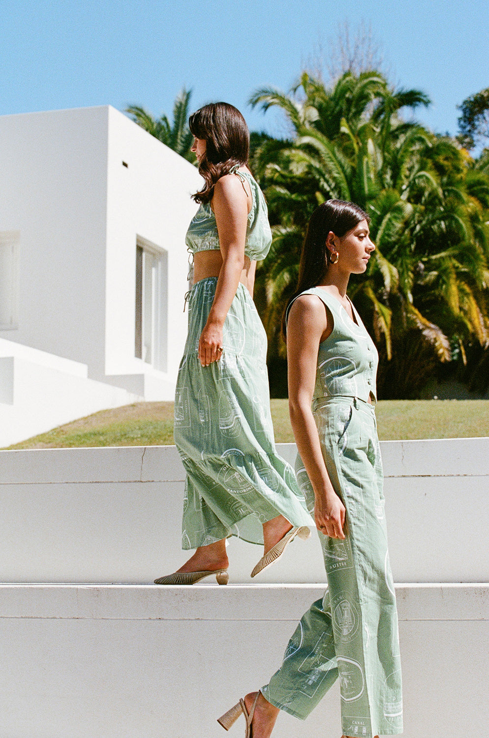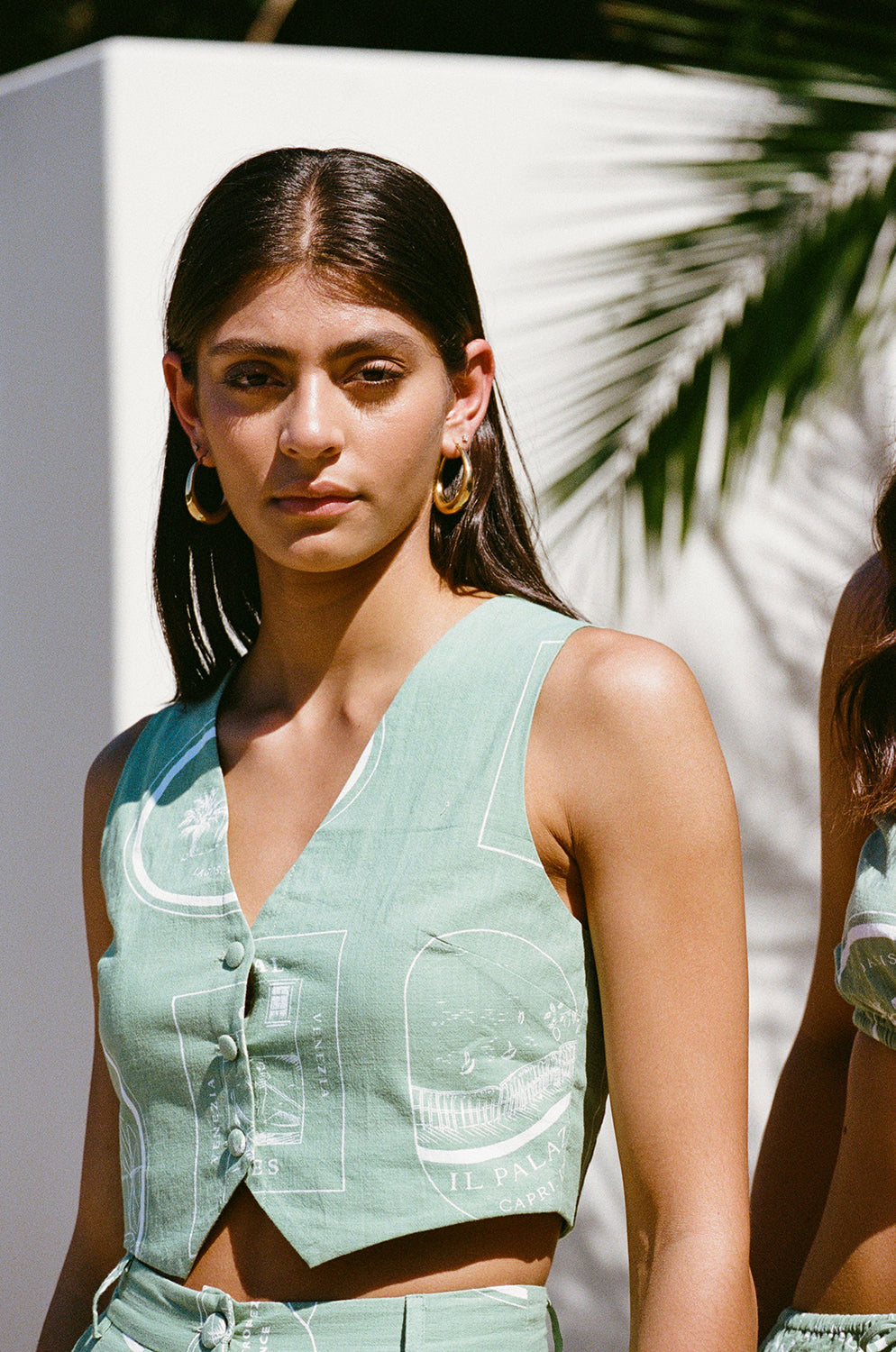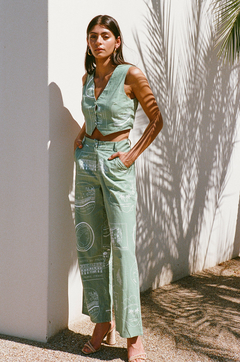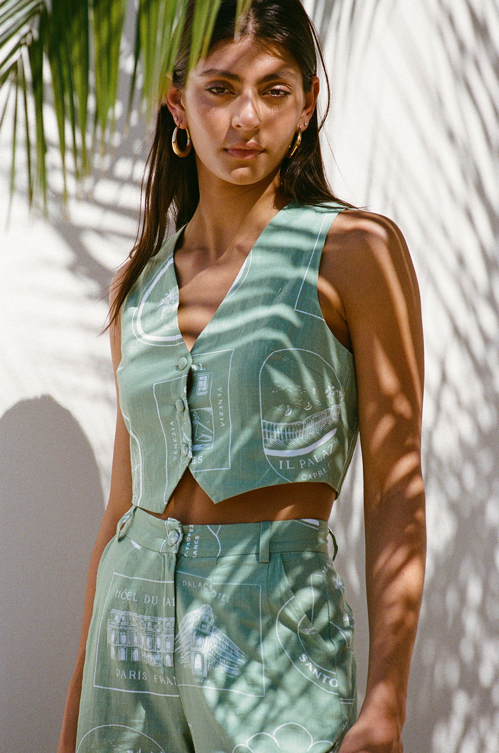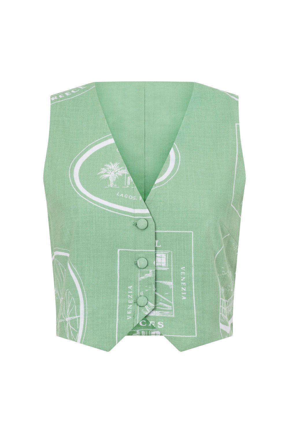 For our lovers of a structured set! The Montana Top is made from a high quality cotton slub fabric with our exclusive new luggage labels print. It is a vest style top featuring a V neckline, covered buttons at front and a cropped waist with dip at centre front. Get the set with the Montana Pants! Designed exclusively by Sabo.
