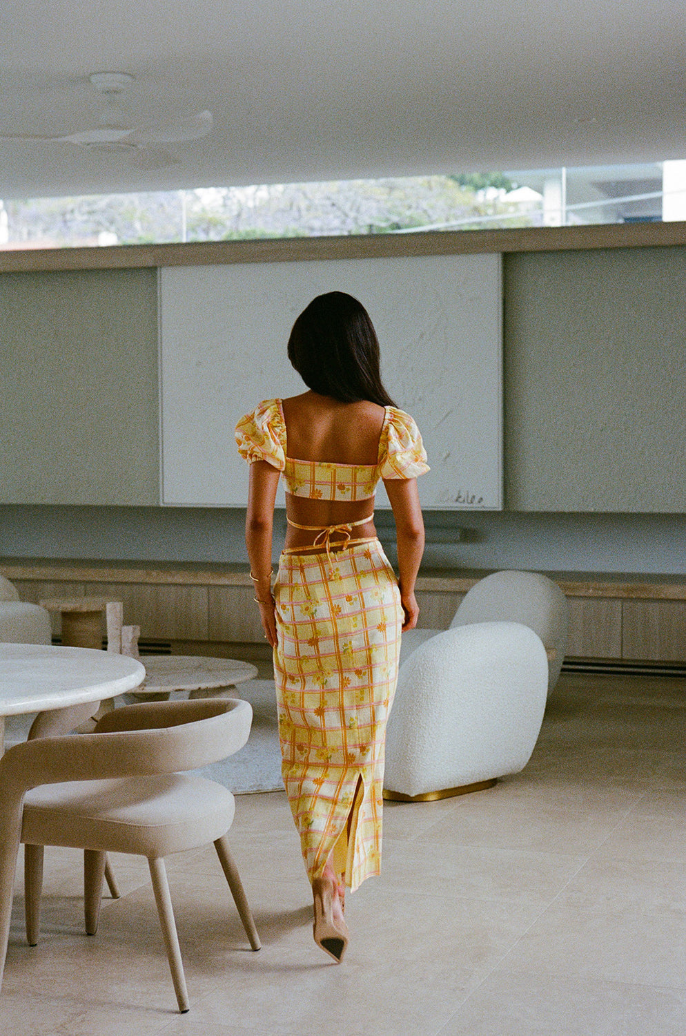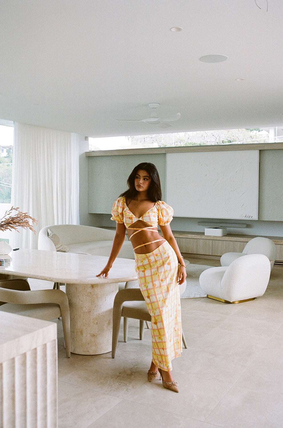 The vintage inspired Myah Midi Skirt is made from a natural cotton cheesecloth fabric with our exclusive floral plaid print. It is a high waisted style featuring an attached belt, V waist and midi skirt with split at centre back. Get the set with the Myah Top! Designed exclusively by Sabo.