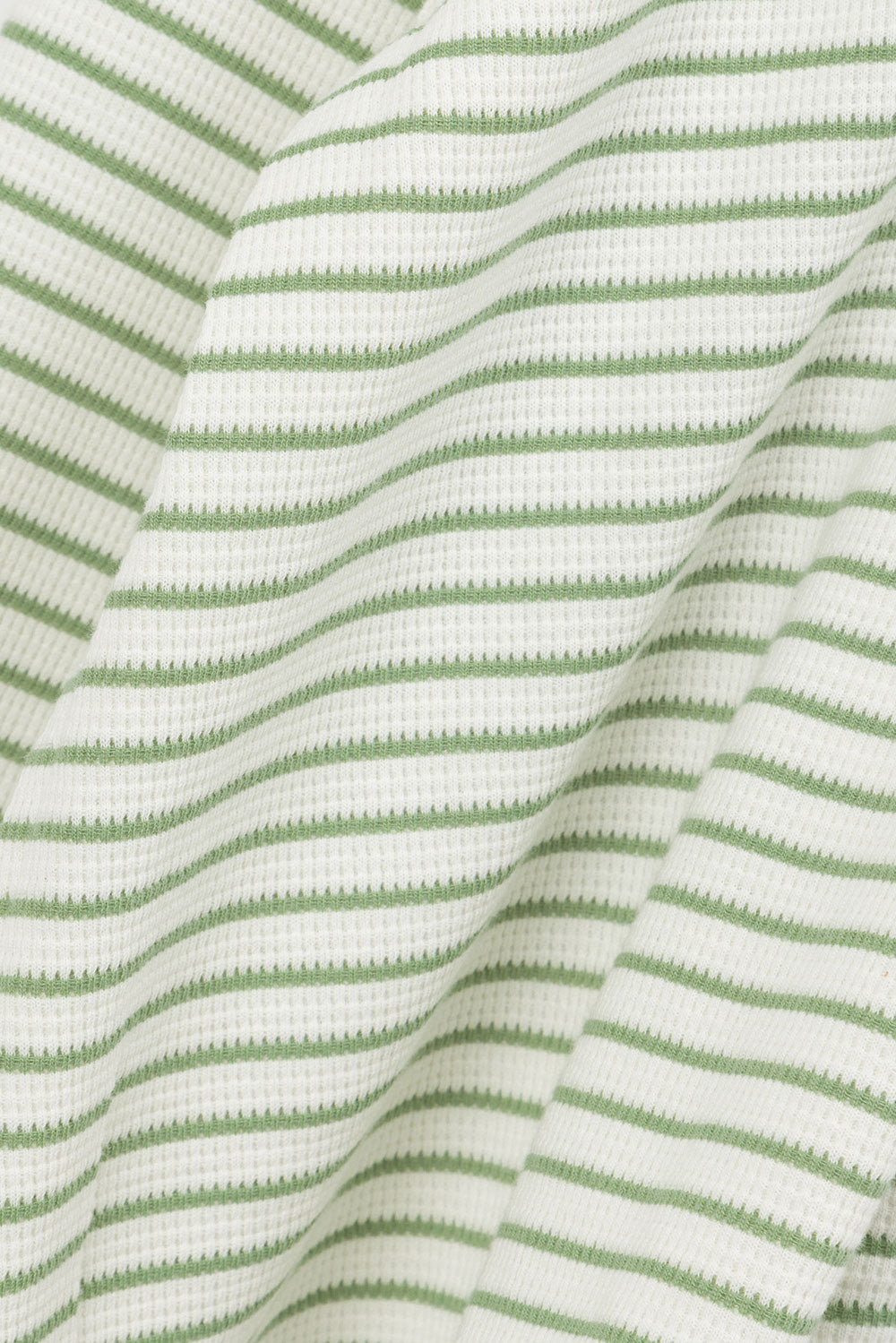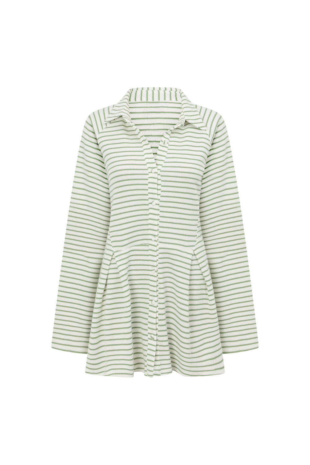 Perfect over bikinis on vacay or a go-to weekend look! The Myra Dress is made from a light woven natural cotton blend fabric and features mint and off white stripes, collar and button closure at front, full length sleeves and a mini skirt with pleat details. Style with white sandals! Designed exclusively by Sabo.