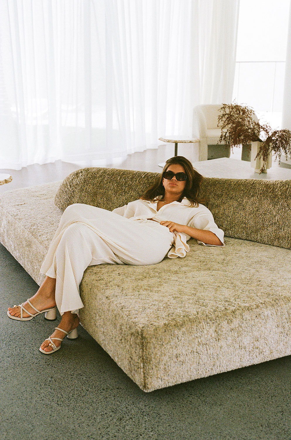 A vintage inspired set that is super luxurious and comfy! The Naiara Top is made from a structured pleated fabric in a cream hue and features a relaxed fit, drop shoulders with short sleeves, collar and buttons down centre front. Get the set and pair with the Naiara Pants and style with slides! Designed exclusively by Sabo.