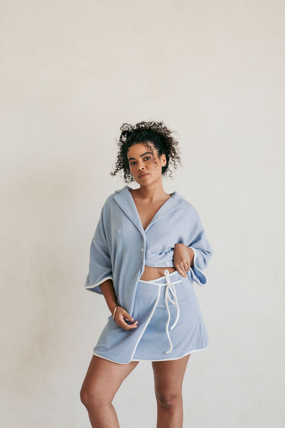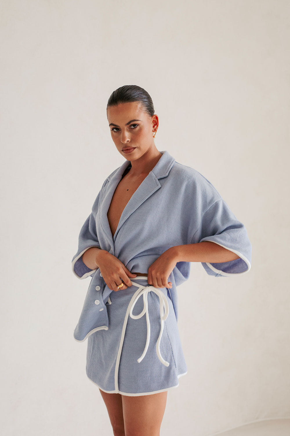 Wear it as a set or pair it back with a tank, the Nari Skirt is made from a ribbed fabric in a blue hue. It is a high waisted style featuring a wrap panel at front and contrast white bind trims. Designed exclusively by Sabo.