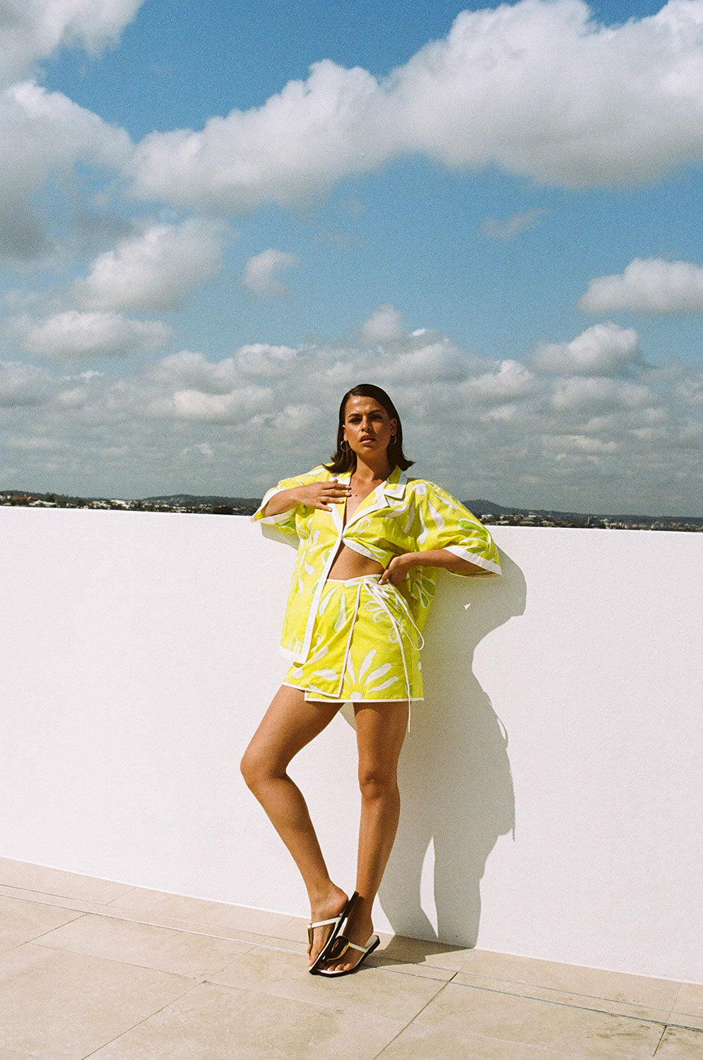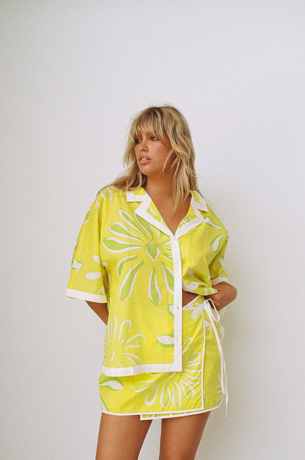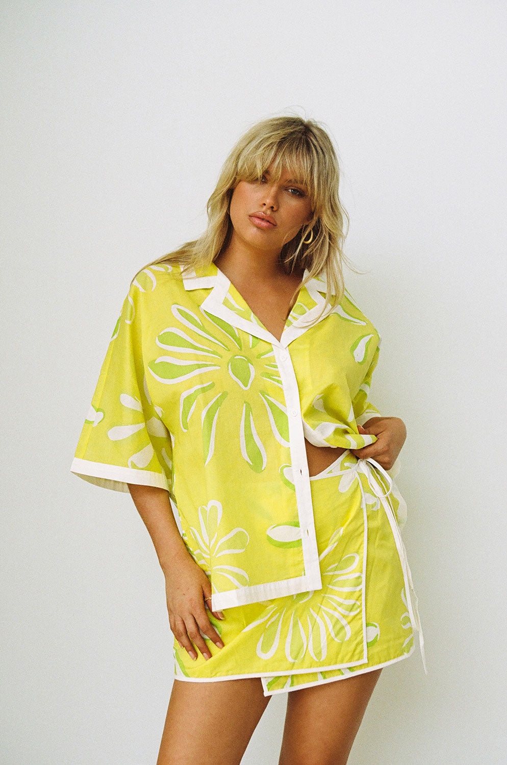 The summer inspired Nellie Wrap Skirt is made from a high quality natural cotton voile fabric with our exclusive floral splice print. It is a mini style featuring contrast white bind trims. wrap panel at front and a wrap tie at waist. The perfect set to throw over bikinis! Designed exclusively by Sabo.