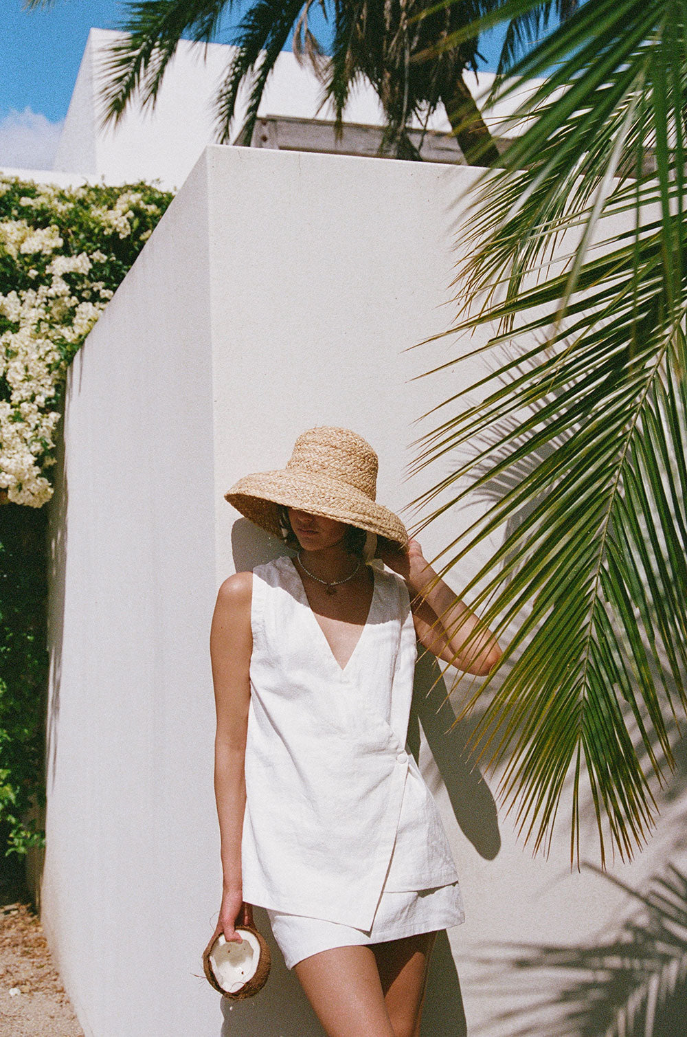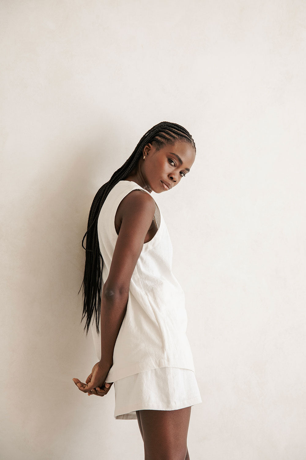 Wear it as a set or use it as a styling piece! The Nicola Top is made from a natural structured ramie cotton blend fabric in white. It is a relaxed style featuring a V neckline with wrap panel at front, button closure at side and asymmetric hem. Get the set and pair with the Nicola Skirt! Designed exclusively by Sabo.