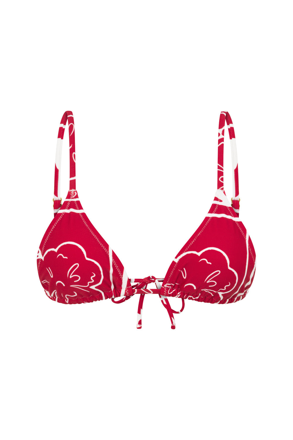 Inspired by sun drenched summers, the Nusa Tri Top is made from a high quality stretchy swim fabric with our exclusive Red Voyage print. It features micro tri cups, thin adjustable shoulder straps and tie at back. Get the look with the Nisi Tie Bottom or Nusa Scrunch Bottom and matching Par La Mer Top! Designed exclusively by Sabo.