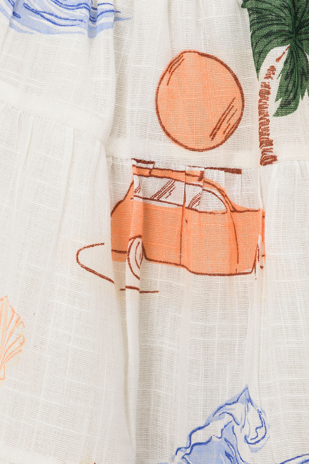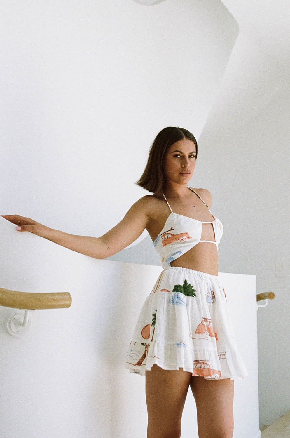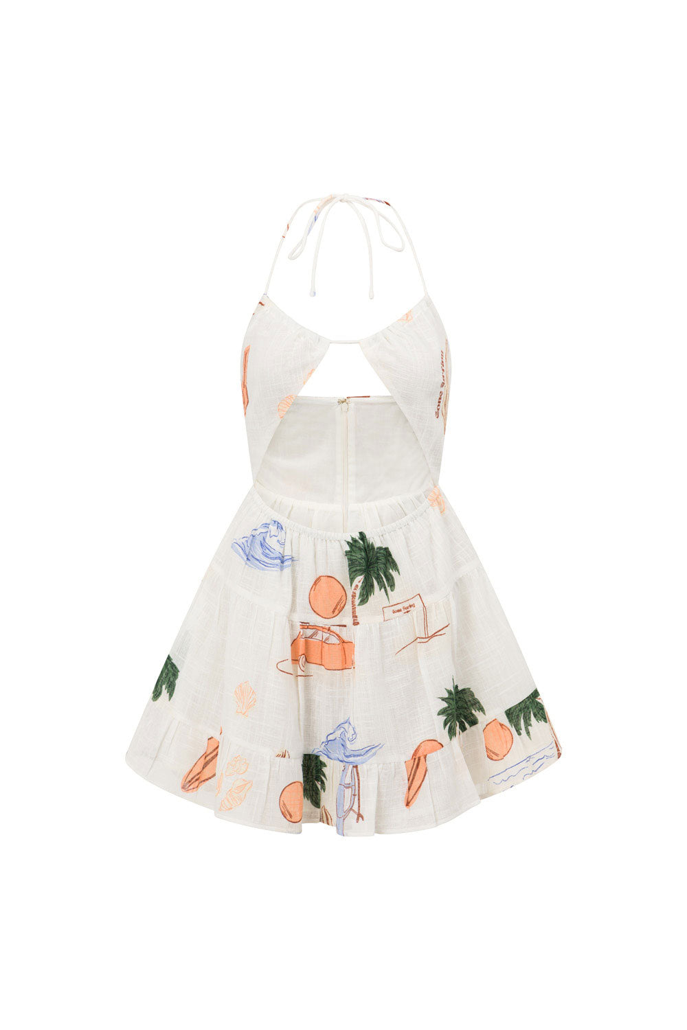 The beach inspired Oriana Cutout Dress is made from a high quality textured cheesecloth cotton fabric with our exclusive Sabo surf print. It features a halter tie neckline, cutout at waist with strap between bust, elasticated waist and flouncy tiered mini skirt. Style your look with neutral slides and a tote for a cute summer look! Designed exclusively by Sabo.