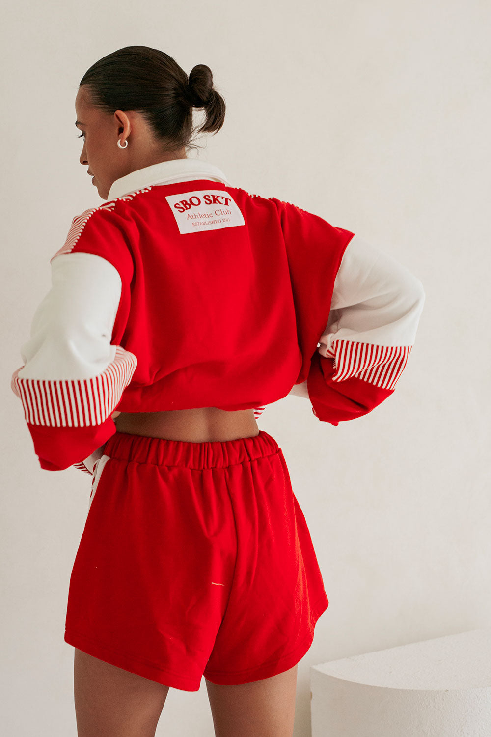 The country club inspired Orlando Shorts are made from a high quality sweater terry cotton fabric in a vibrant red hue. They are a high waisted style featuring an elasticated waist with drawstring, twin pockets, contrast striped, solid white and red panels and patch detail. Get the set and pair with the Orlando Sweater! Designed exclusively by Sabo.