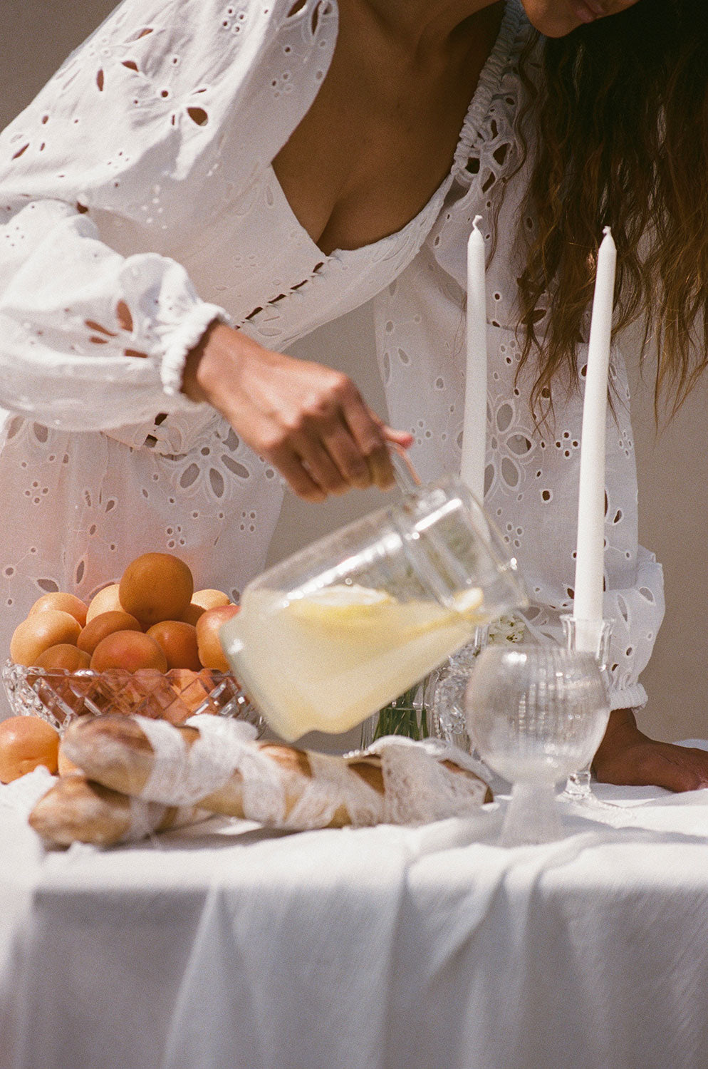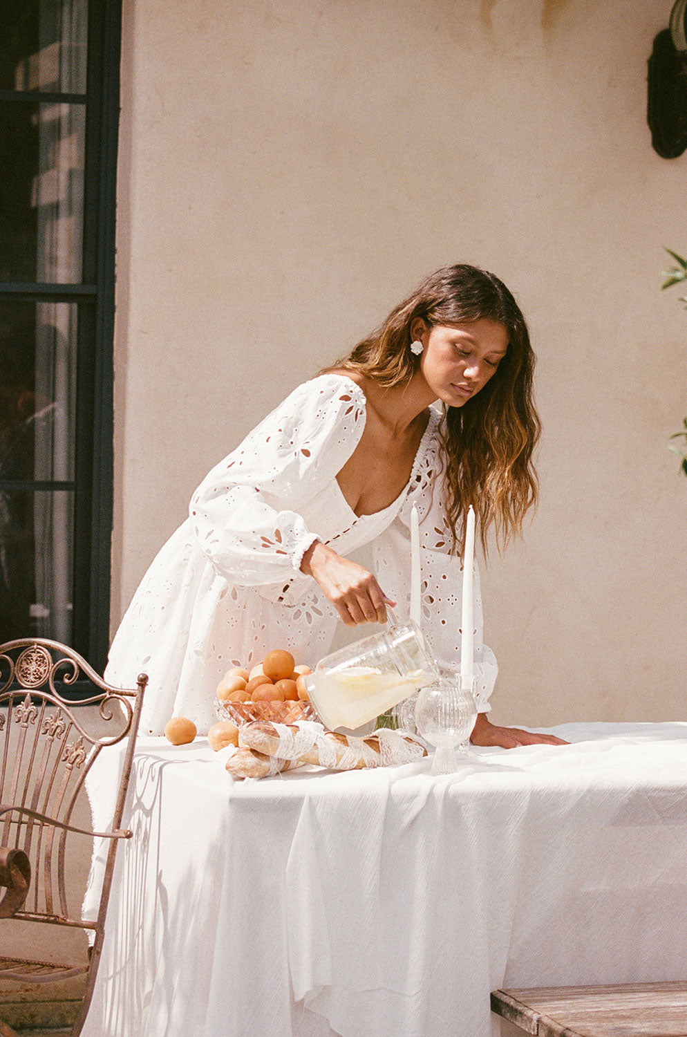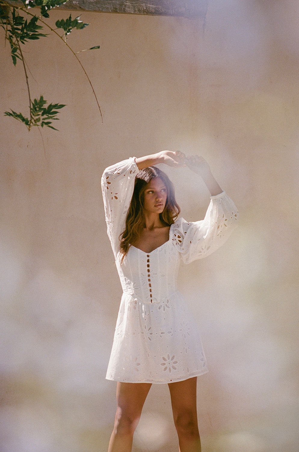 Feminine, structured and designed to flatter! The SABO LUXE Palmier Dress is made from a high quality cotton broiderie fabric in white and features puff sleeves, structured boned bodice, split at centre front with covered button details and a flouncy mini skirt. Dress it up with heels for your next event! Designed exclusively by Sabo.