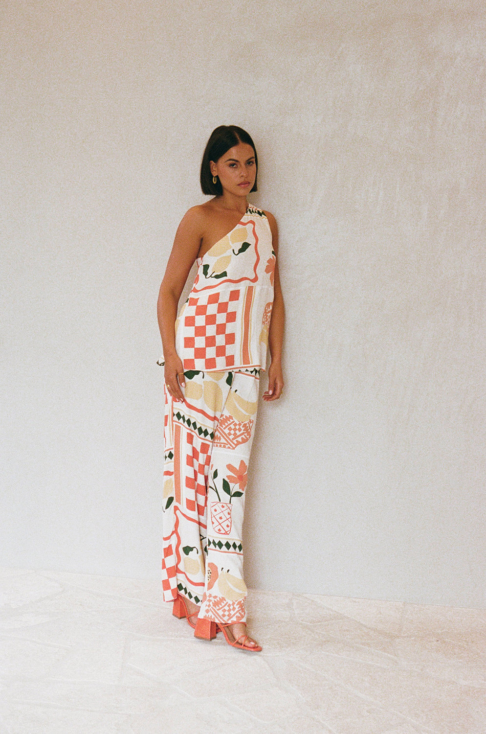 Inspired by Italian summers, the Parlour Top is made from a high quality crepe viscose fabric with our exclusive new prego rossa print. It is a one shoulder style featuring a relaxed fit and a longline hem. Style with the Parlour Pants or keep it casual with the Seona Shorts! Designed exclusively by Sabo.