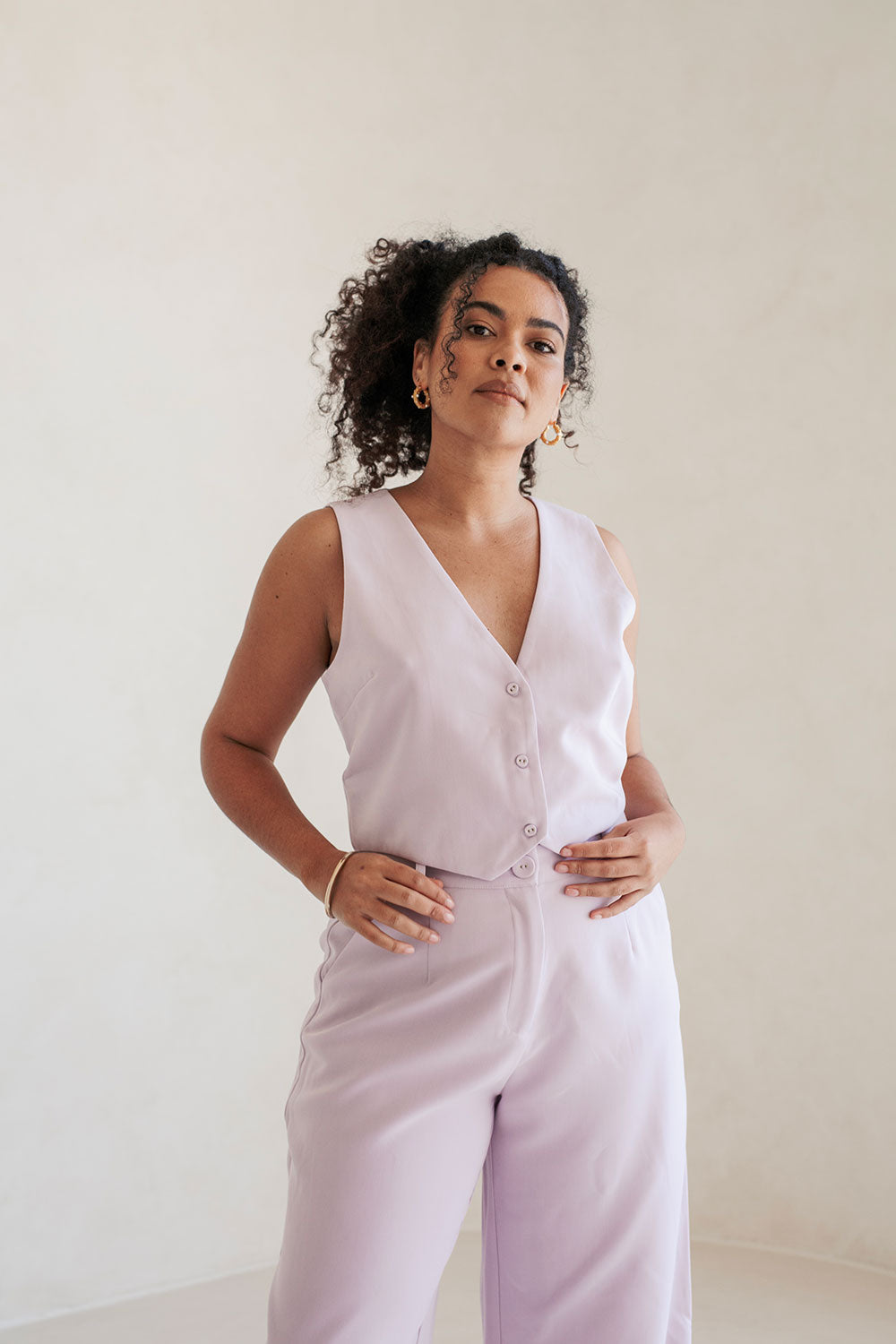 The perfect set for our lovers of structured pieces! The Peri Top is made from a high quality suiting fabric in a pleasant lavender hue. It is a vest style featuring a V neckline, buttons at centre front and a pointed hem. Get the set with the Peri Pants! Designed exclusively by Sabo.