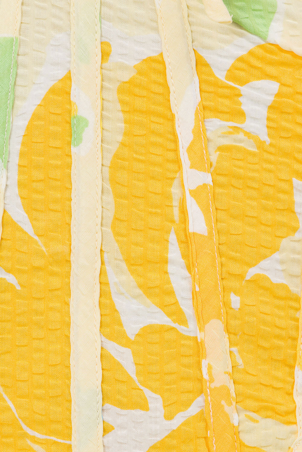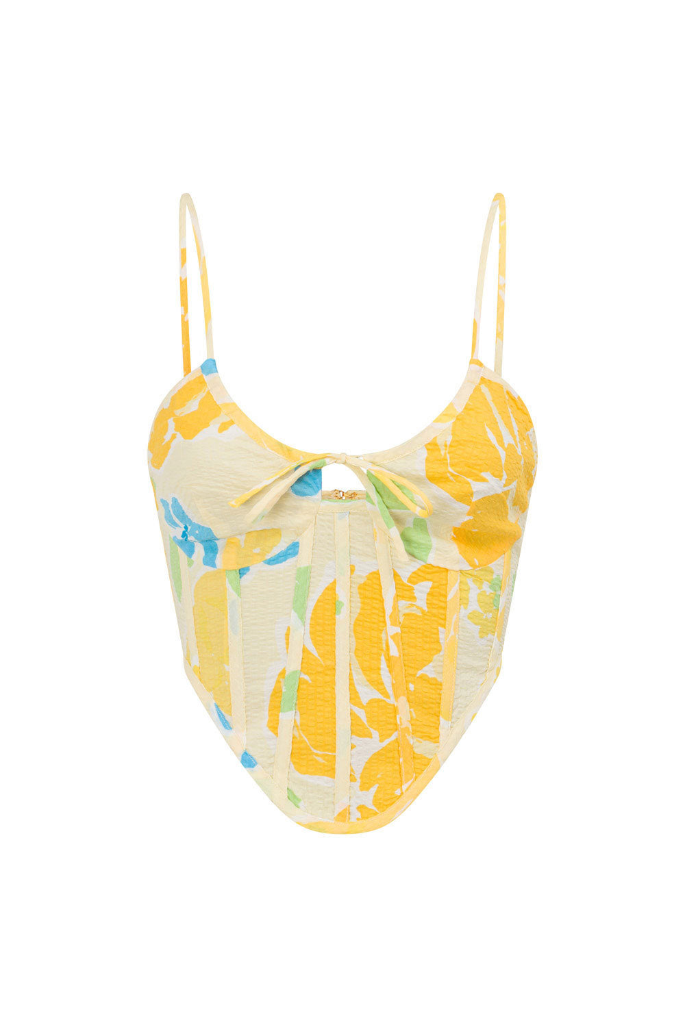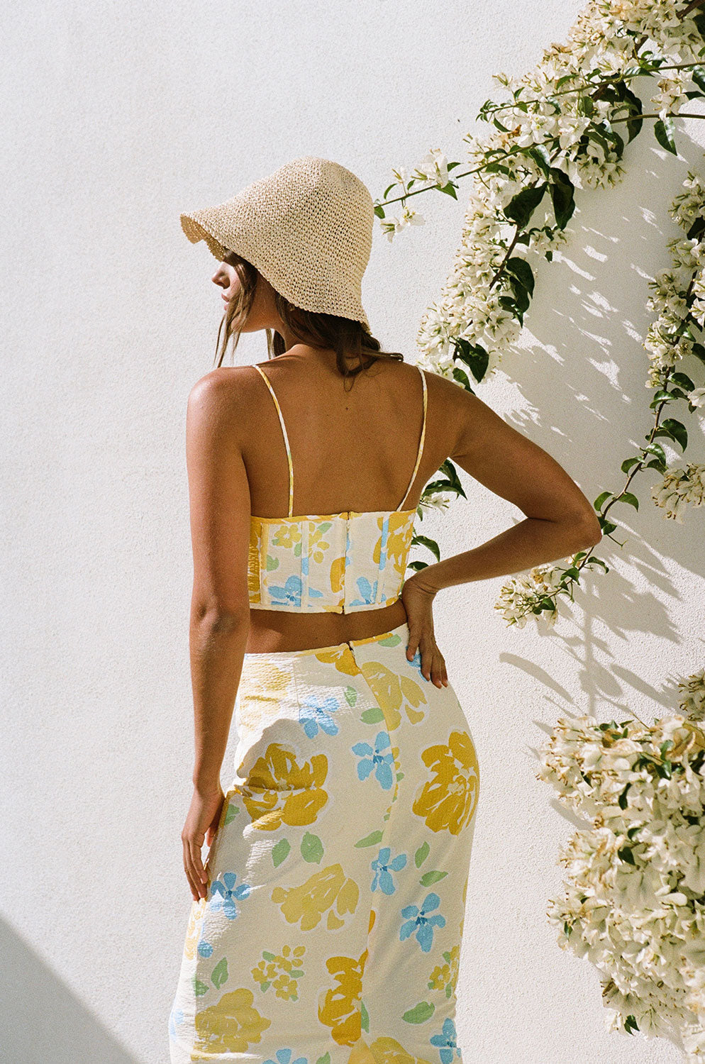 Designed to contour your curves, the Piazza Top is made from a natural cotton seersucker fabric with our exclusive yellow garland print. It features thin rouleau straps adjustable through the neckline, cutout at centre bust, boning at bodice for added structural support, contrast bind trims and panels and a curved hem. Get the set with the Piazza Midi Skirt! Designed exclusively by Sabo.