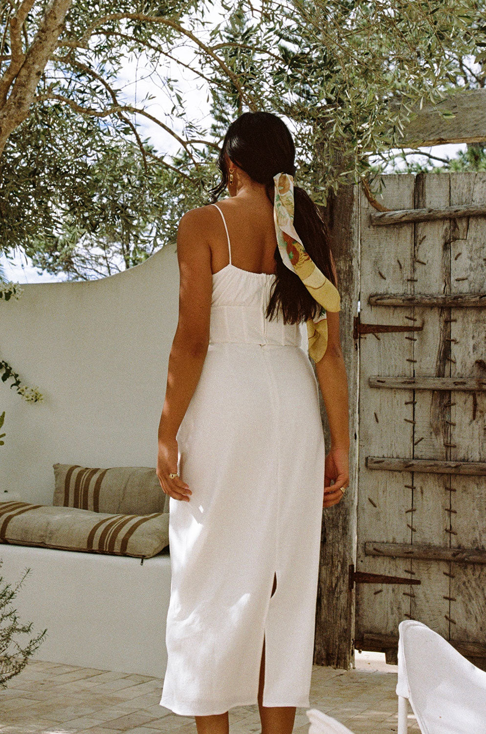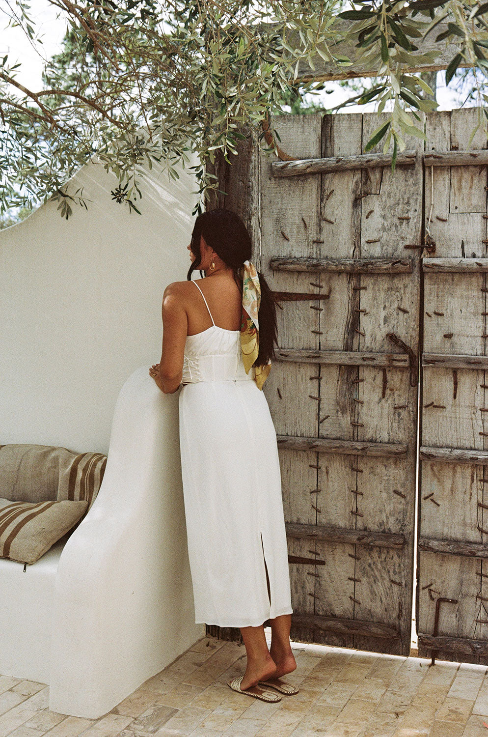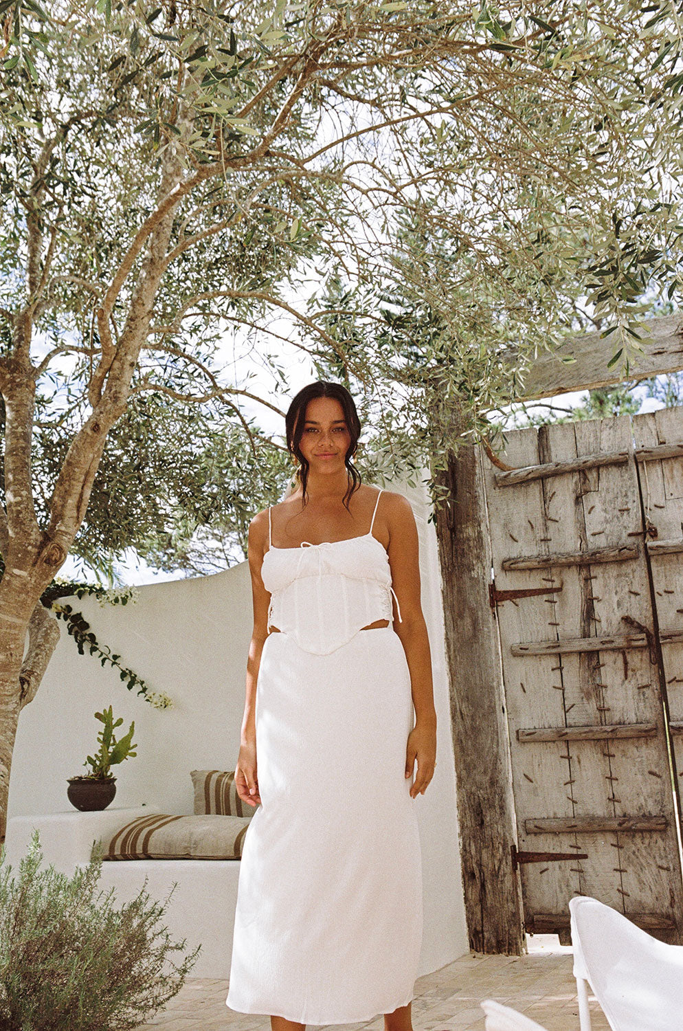 The perfect outfit for a long lunch, the Poppy Skirt is made from a textured stretch fabric in white. It is a high waisted style featuring a split at centre back. Get the set with the Poppy Top! Designed exclusively by Sabo.