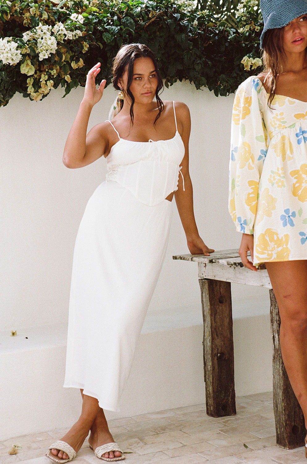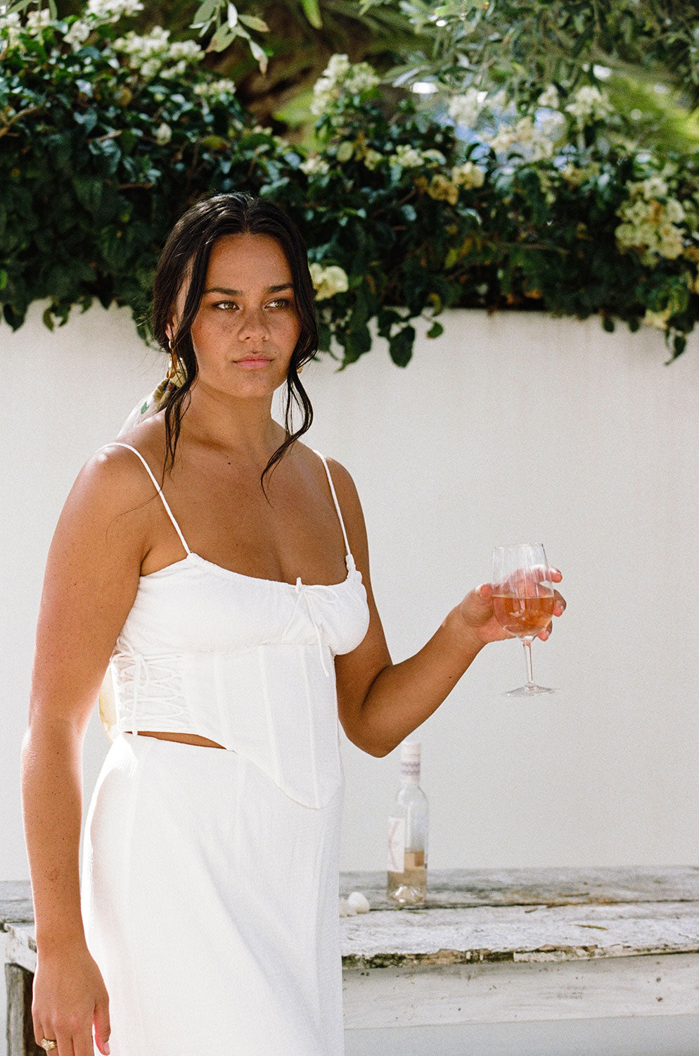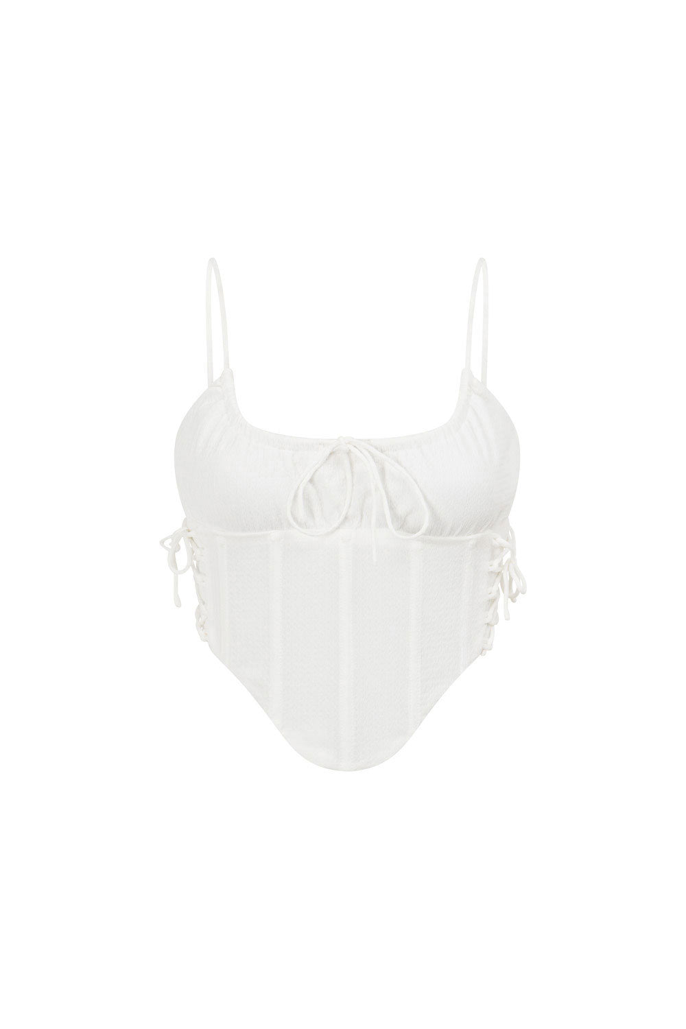 Wear it as a set or elevate your casual look! The Poppy Top is made from a textured stretch fabric in white. It feature adjustable rouleau straps, a draw scoop neckline, lace up details at sides of waist, boning for added structural support and a curved hem. Get the look with the Poppy Skirt! Designed exclusively by Sabo.