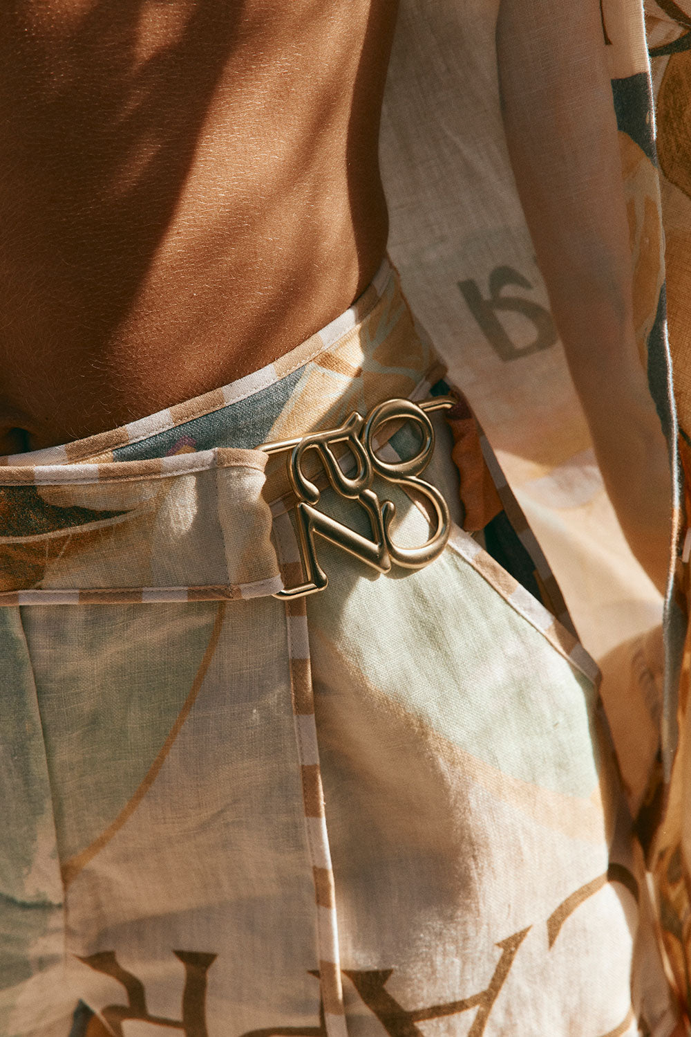 The Portofino Shorts in our exclusive Fiorire Acqua print from our Summer '25 collection. A linen high waisted pair with an asymmetric wrap belt panel with gold ZĀCO hardware, twin pockets and contrasting bind details. Pair with the Portofino Top or Shirt. Exclusive ZĀCO design.