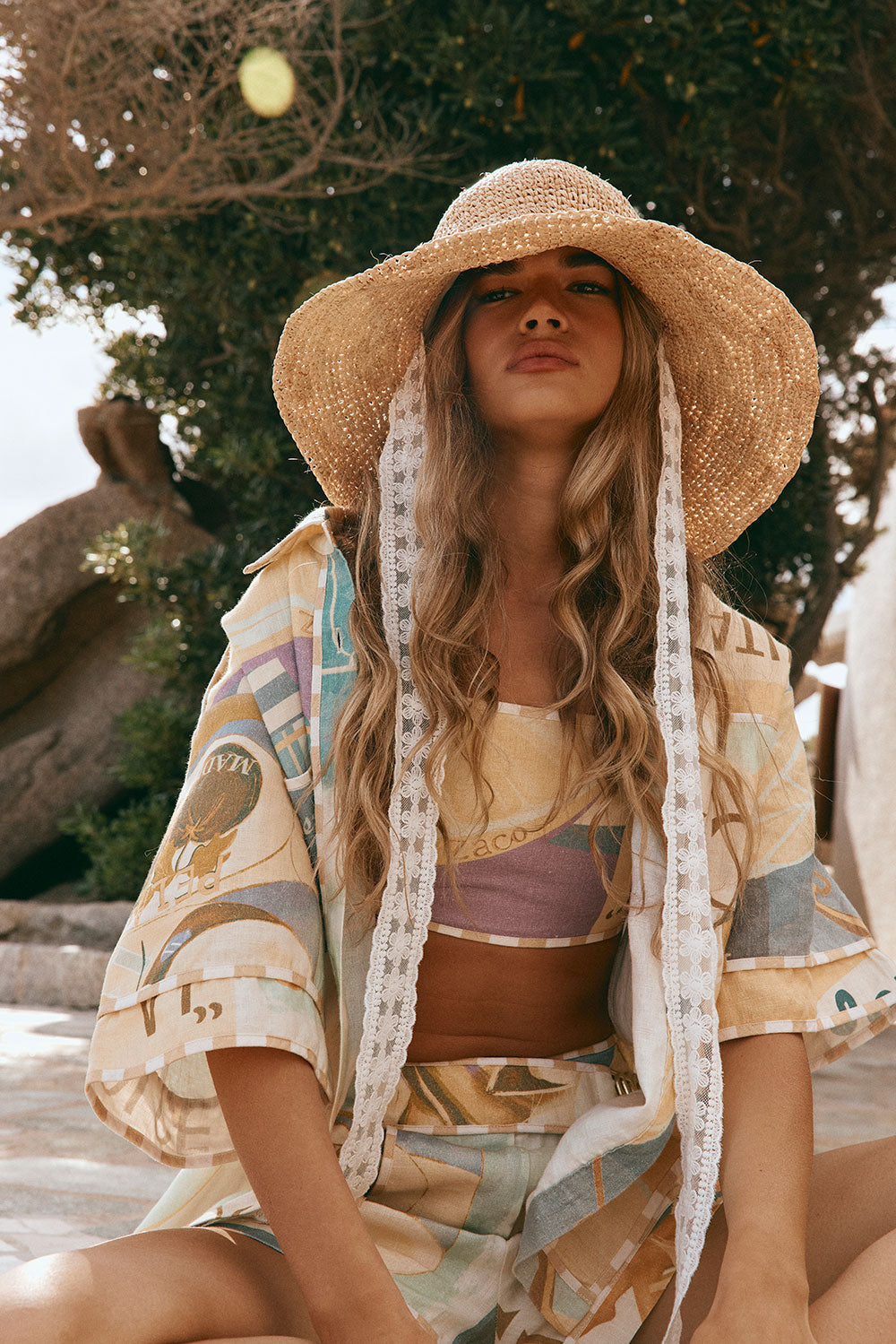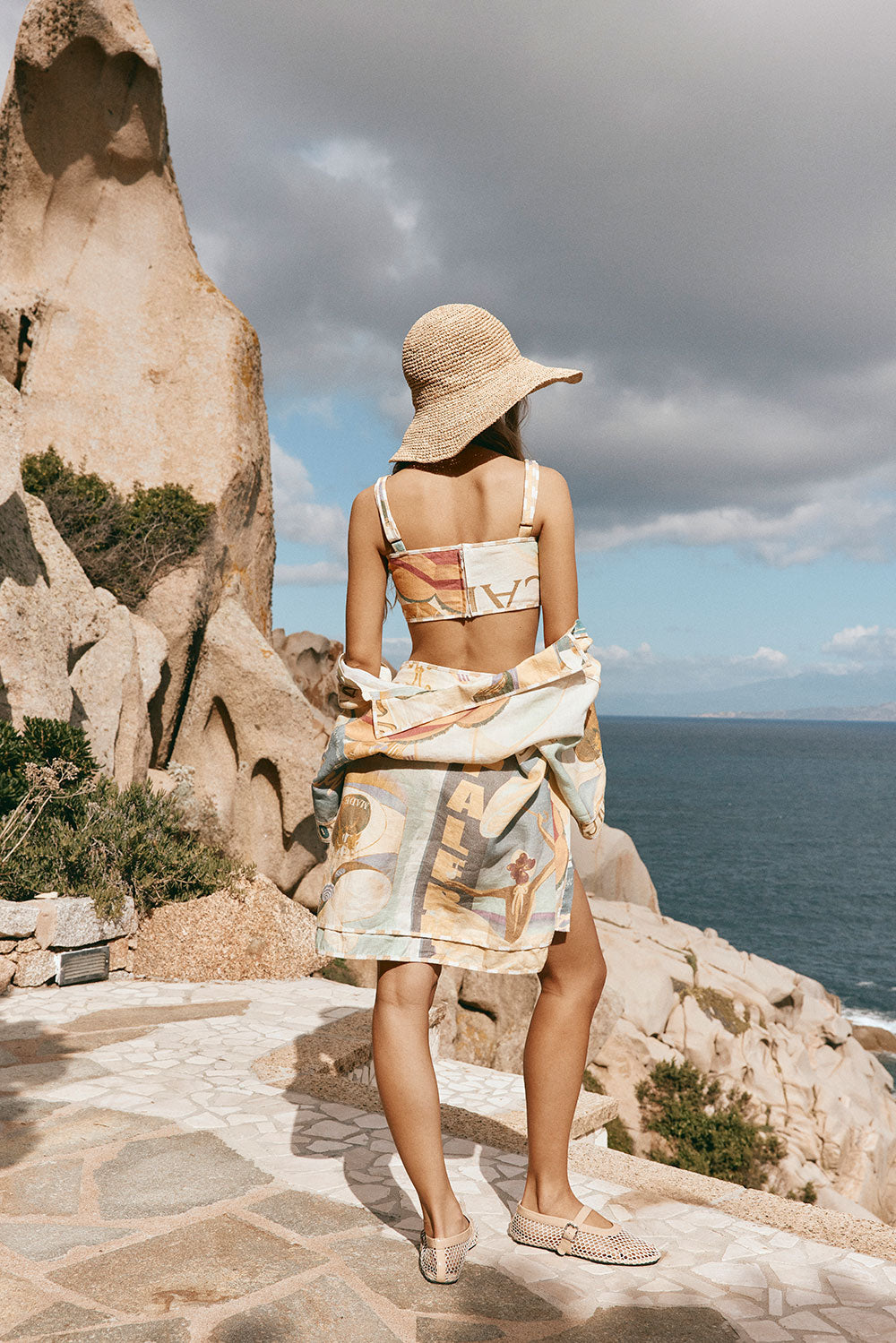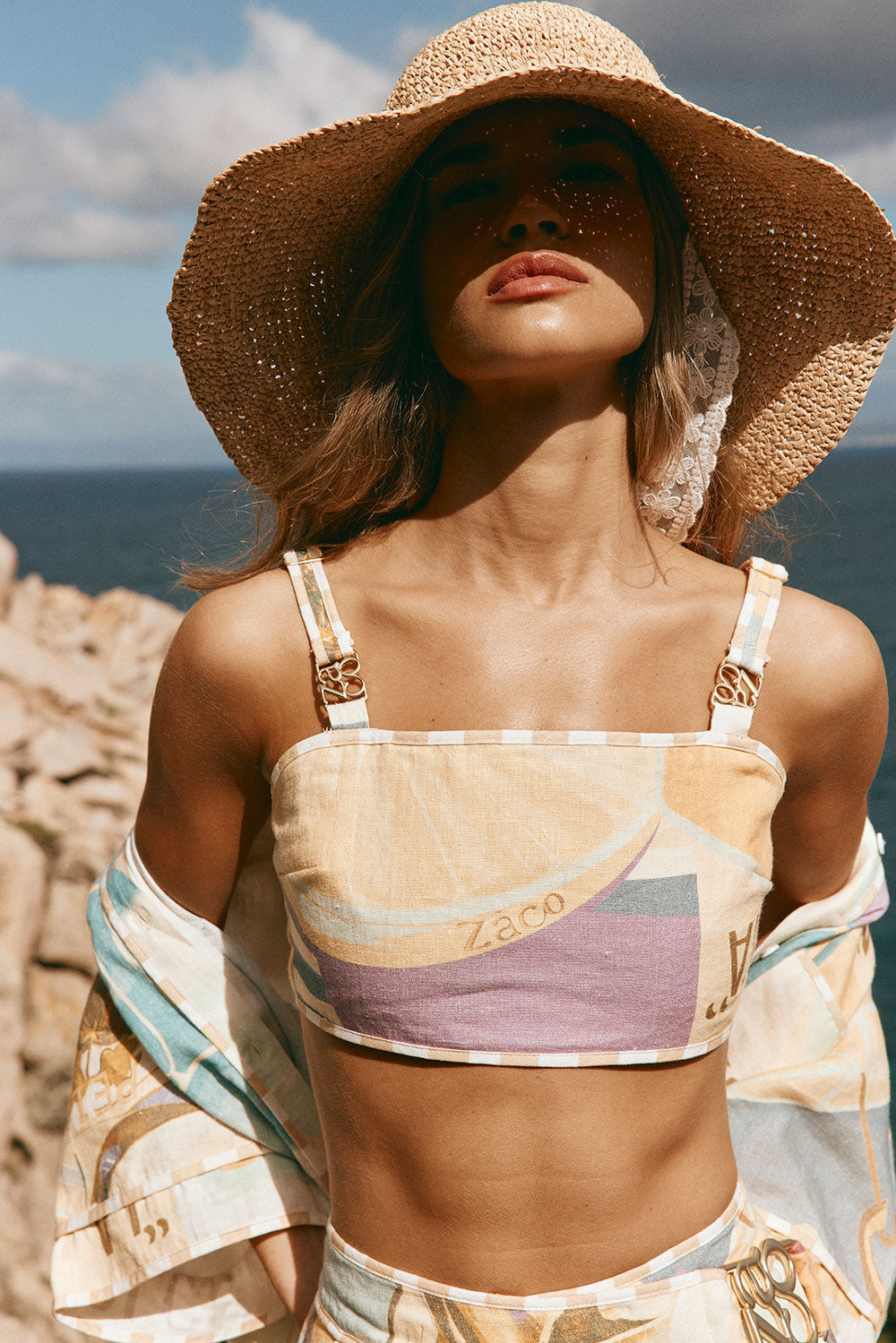 The Portofino Top in our exclusive Fiorire Acqua print from our Summer '25 collection. A linen bandeau top with thick adjustable straps with gold ZĀCO hardware and contrasting bind trims. Pair with the Portofino Shorts and Portofino Shirt. Exclusive ZĀCO design.