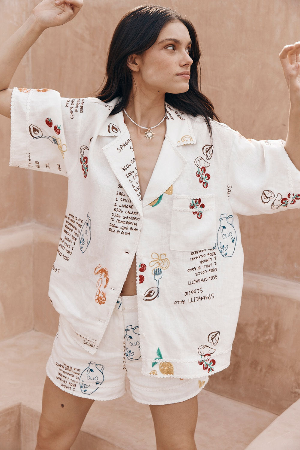 Our exclusive embroidered Spaghetti Allo Scoglio print on a crisp white linen base is a part of our Autumn '24 collection. The Praiano Shorts feature ric rac trims and twin pockets. Pair with the Praiano Top. Exclusive ZĀCO design.