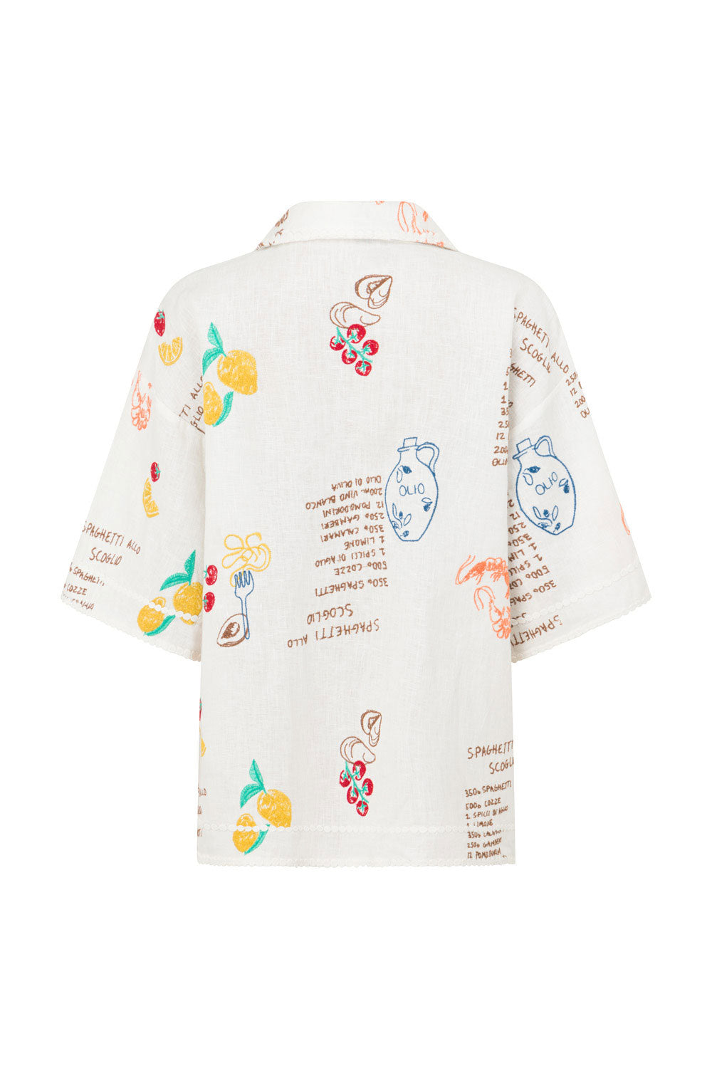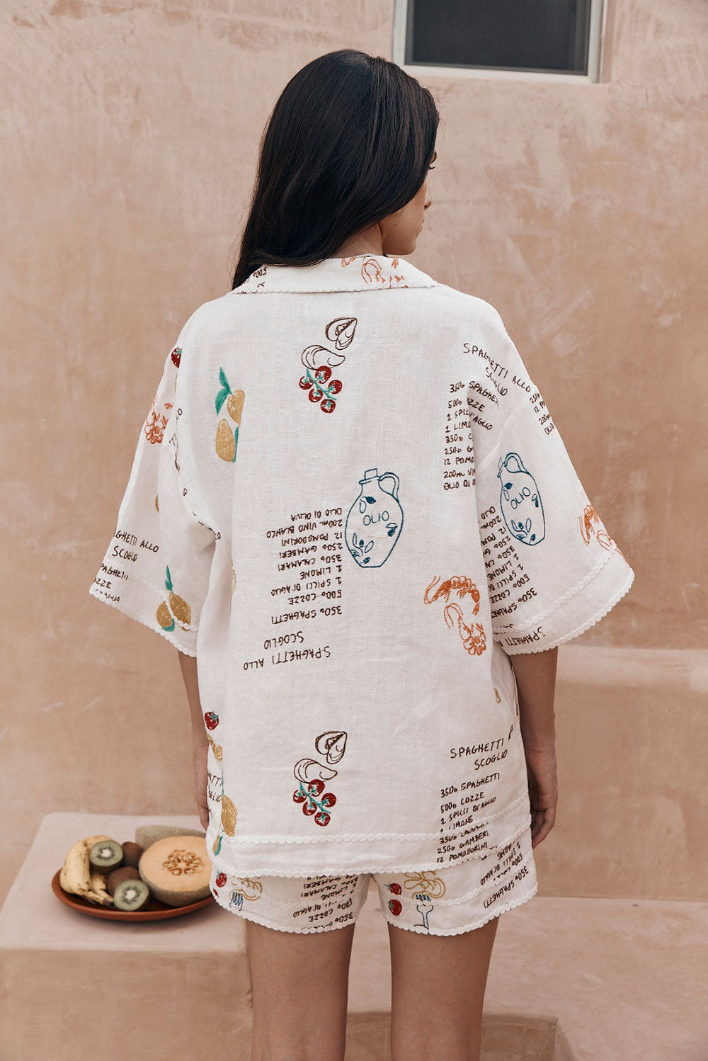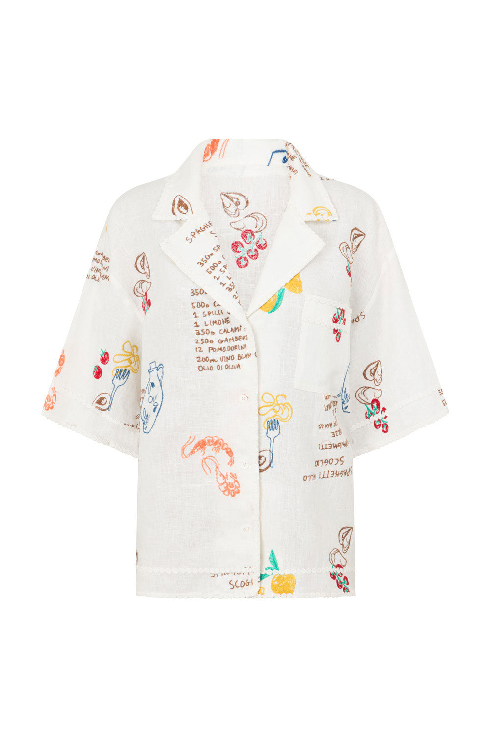 Introducing our Autumn 24' collection with the Praiano Top, a resort wear piece with our exclusive Spaghetti Allo Scoglio print. It features ric rac trims and panels throughout, collar and low lapel, single breast pocket and buttons at centre front. Pair with the Praiano Shorts. Exclusive ZĀCO design.