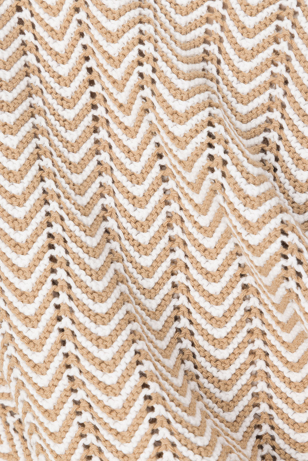 A relaxed yet stylish set, the perfect weekend outfit! The Reims Top is made from a natural woven cotton fabric. It features tan and white zig zag stripes throughout, a boxy fit, drop shoulders with short sleeves, contrast tan ribbed trims and an asymmetric wrap panel at front with button closure. Get the set with the Reims Skirt! Designed exclusively by Sabo.
