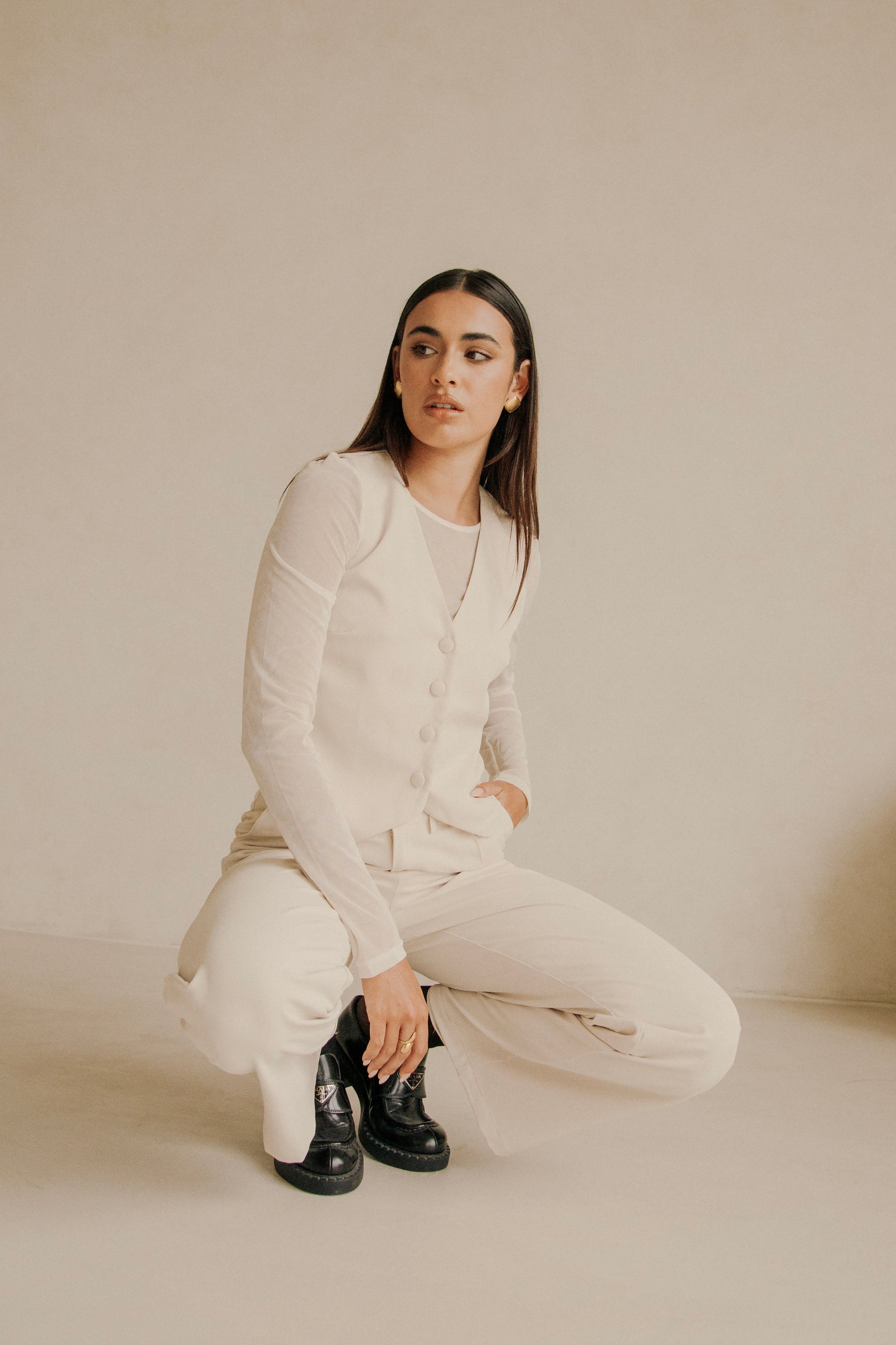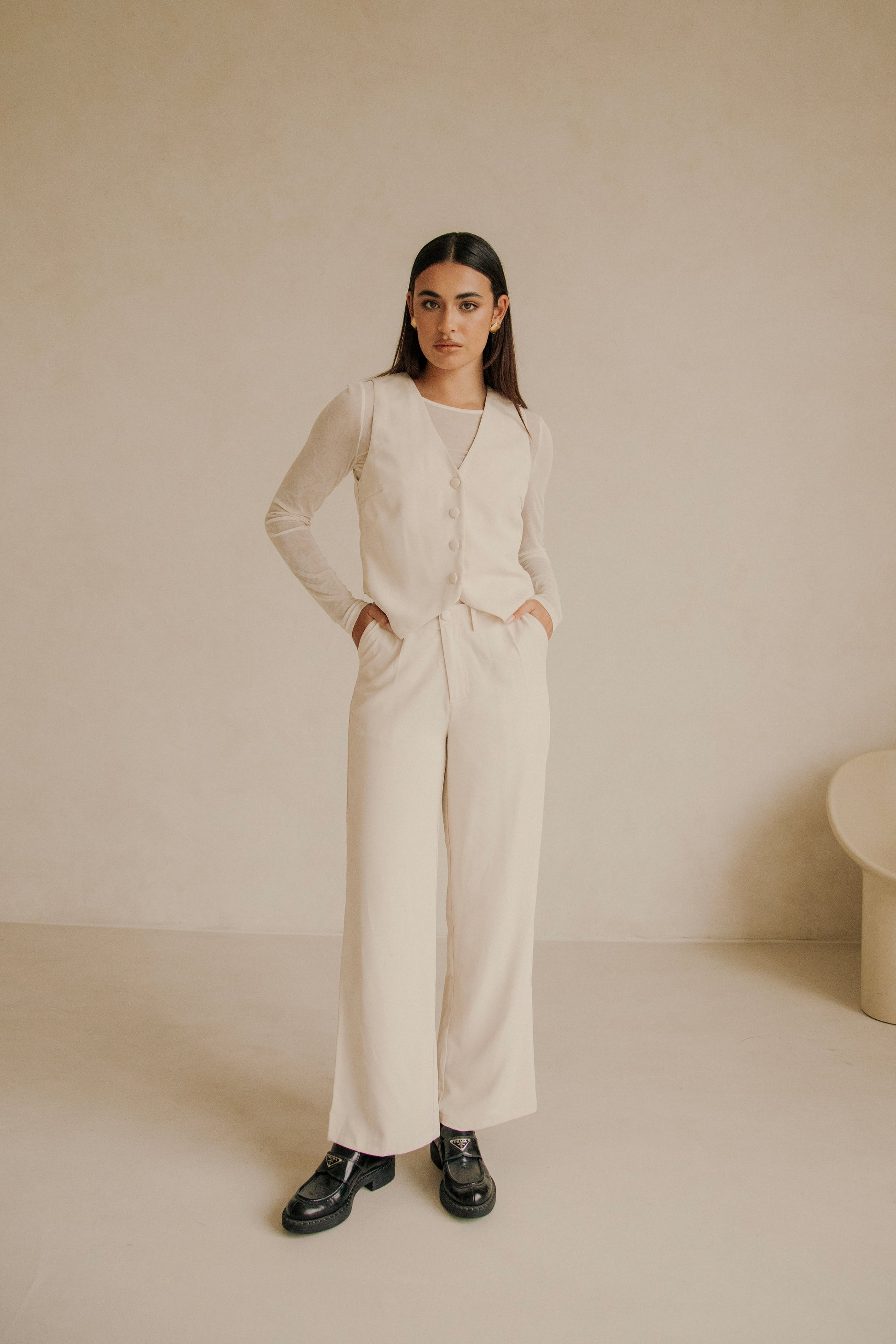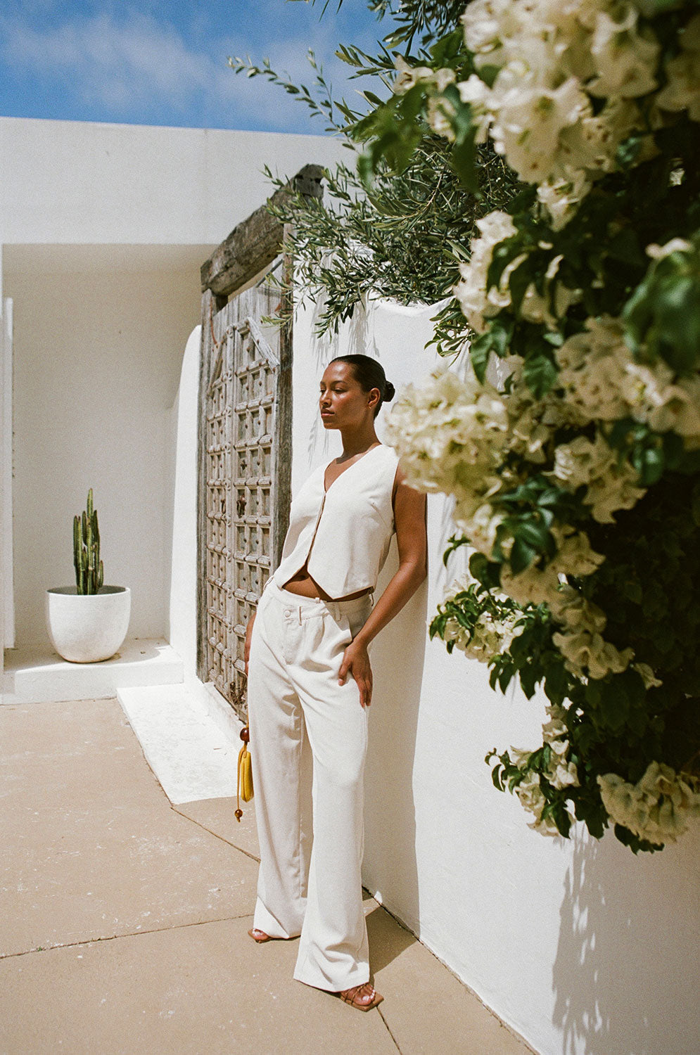 Wear it as a set or style it back with a basic tank! The Remi Pants are made from a luxurious suiting fabric in a cream hue. They are a high waisted style featuring a cross-over waist, twin pockets at sides, twin faux pockets at back and a regular fit pants. Complete the look with the Remi Top! Designed exclusively by Sabo.