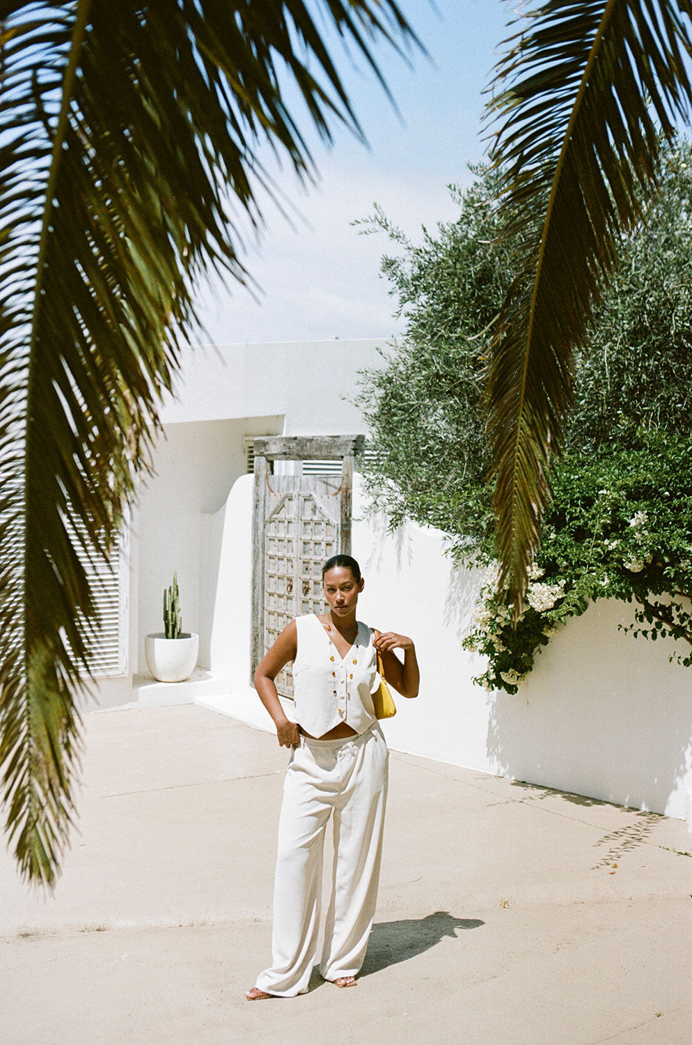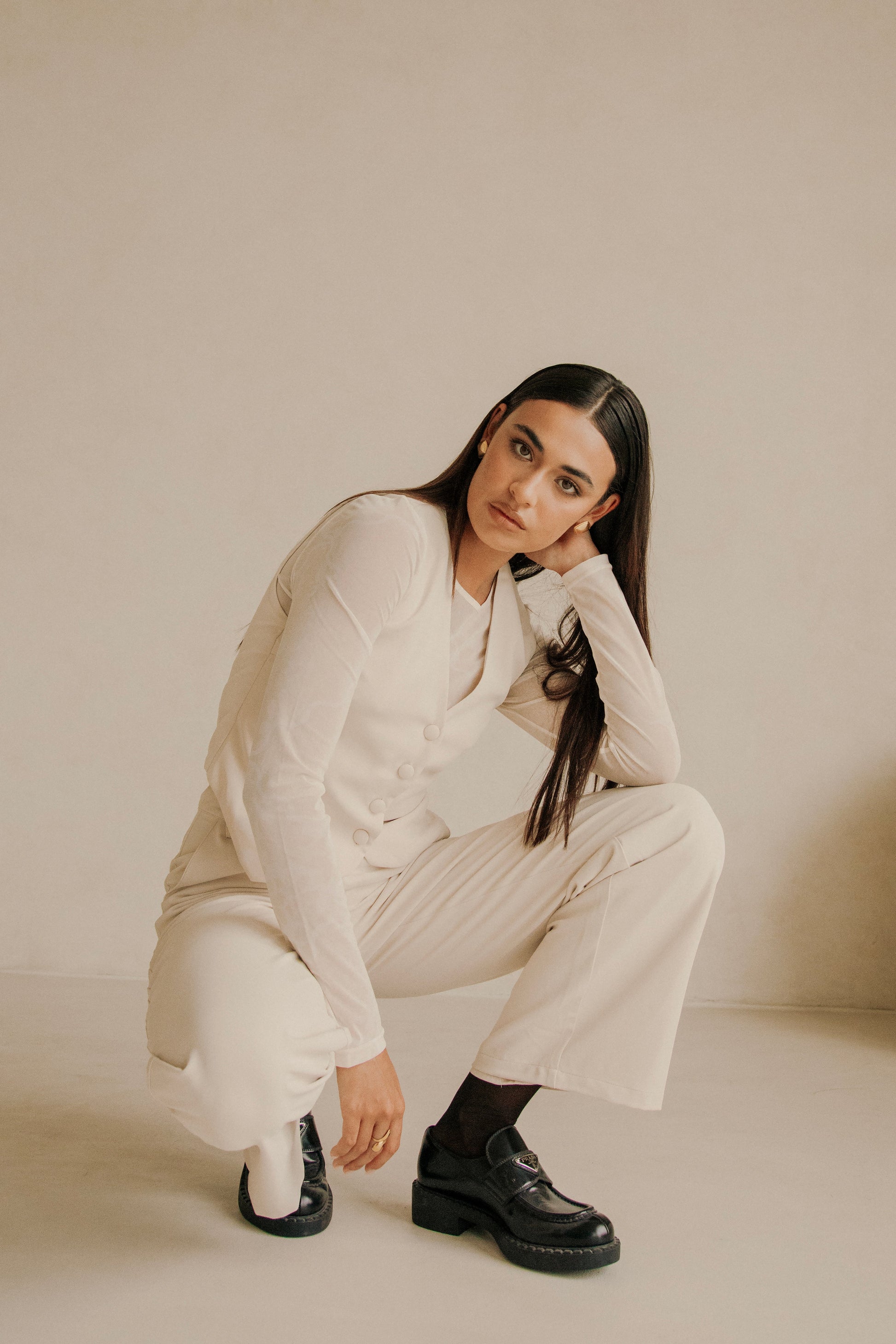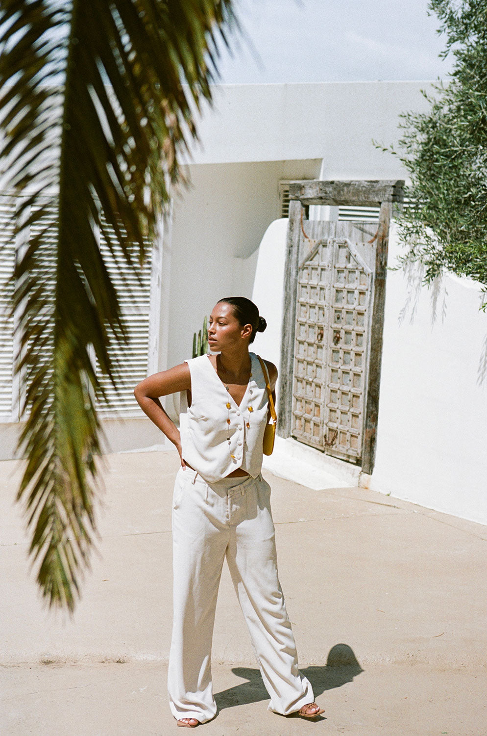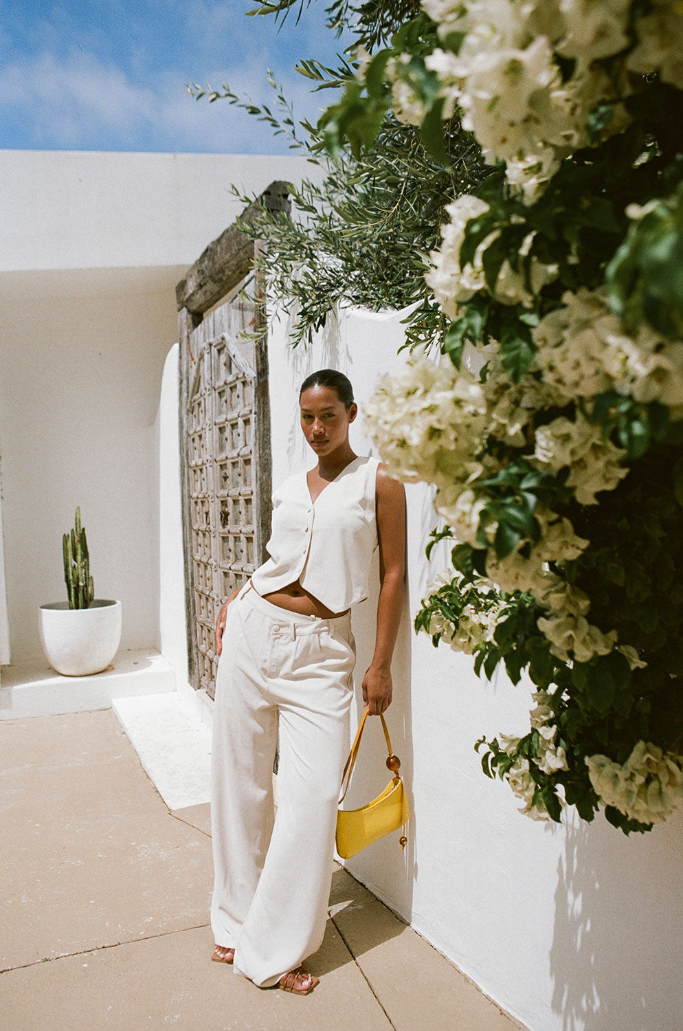 Wear it as a set or style it back with a basic tank! The Remi Pants are made from a luxurious suiting fabric in a cream hue. They are a high waisted style featuring a cross-over waist, twin pockets at sides, twin faux pockets at back and a regular fit pants. Complete the look with the Remi Top! Designed exclusively by Sabo.