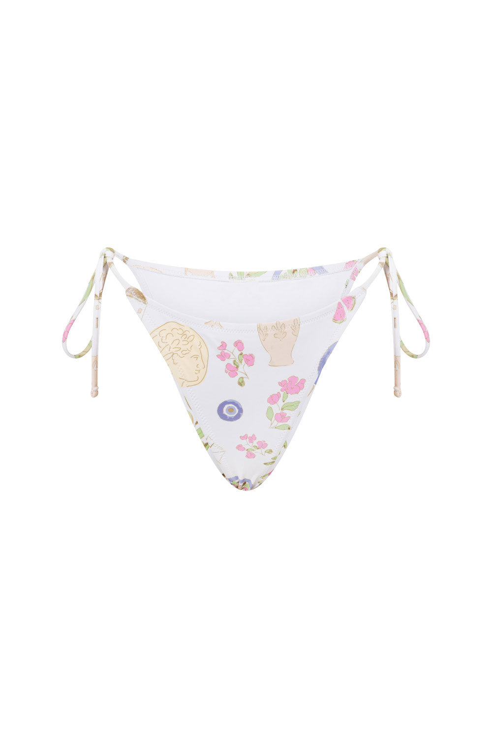 Perfect for vacay, the Rhodes Tie Bottom is made from a high quality stretchy swim fabric with our exclusive Greece print. They are a micro Brazilian cut and feature string ties at sides. Pair with the Rhodeds Tri Top and matching Leta set! Designed exclusively by Sabo.