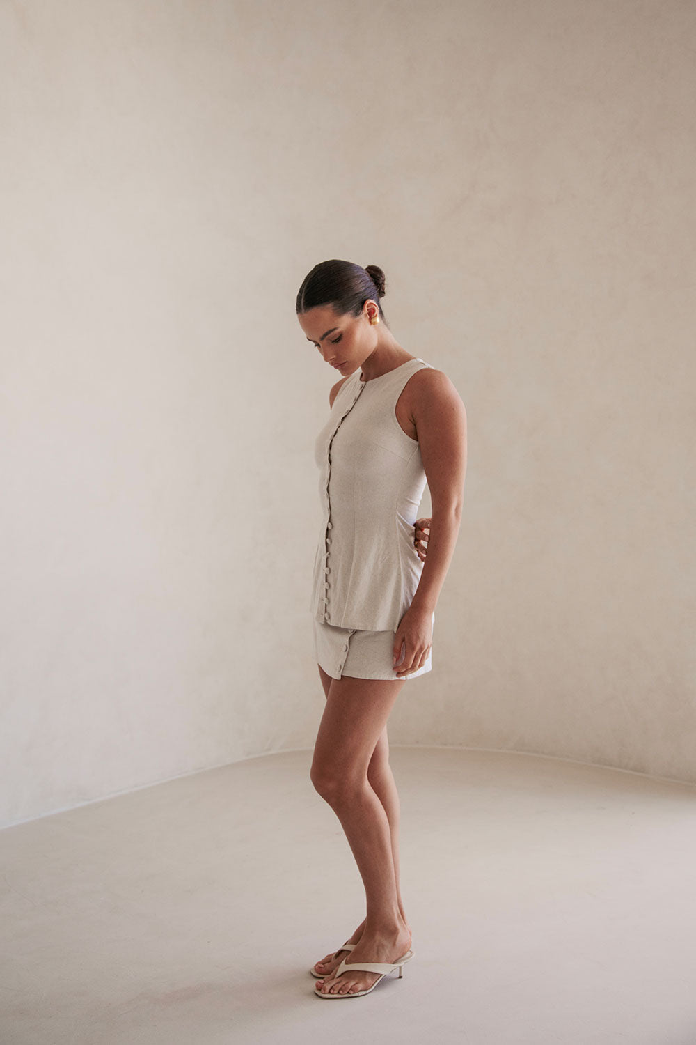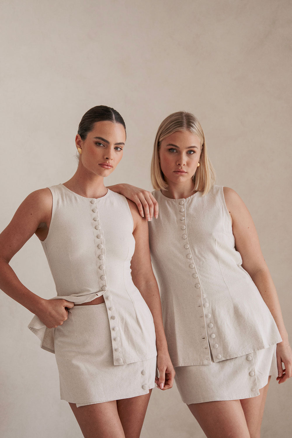 A super cute set and easy-to-style staple! The Rivia Skirt is made from a high quality natural cotton ramie blend fabric in a natural hue. It is a high waisted style featuring a wrap-look panel at front with large covered button details. Get the set and style with the Rivia Top! Designed exclusively by Sabo.