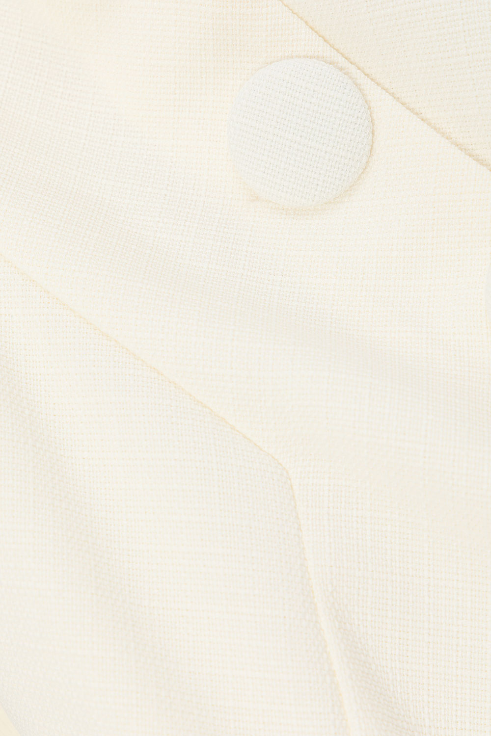 Bold, structured and made to flatter! The Salma Top is made from a woven structured fabric in white. It features a strapless neckline, fixed wrap with large covered button details, longline a-line hem and raw frayed hem. Style with the Salma Pants. Designed exclusively by Sabo.
