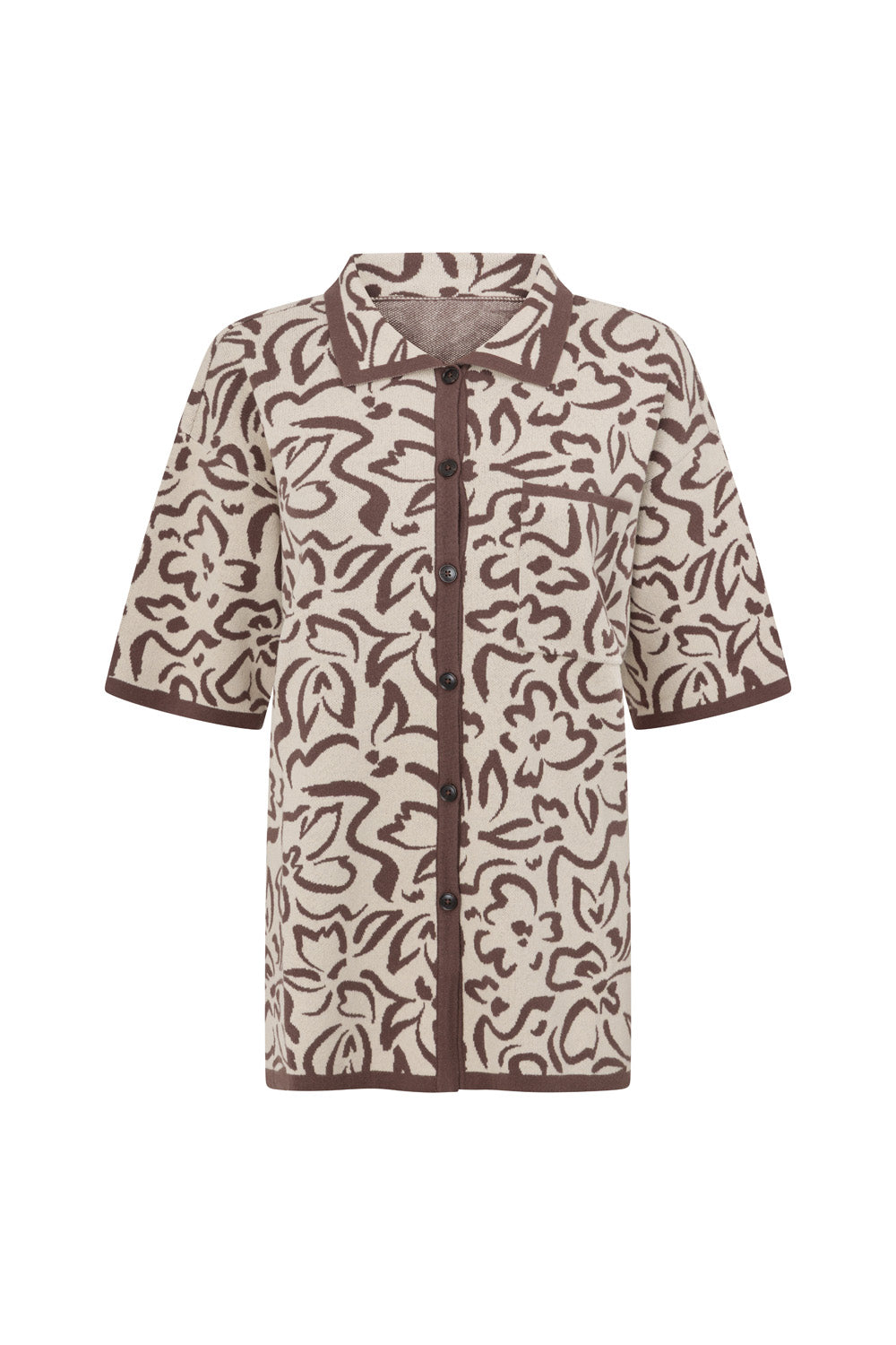 The perfect set for the cooler weather, the Sarai Top is made from a natural cotton intarsia knit fabric in our warm neutral exclusive print. It is a boxy style featuring a collar and button opening, drop shoulders with short boxy sleeves, single breast pocket and contrast chocolate brown trims. Get the set with the Sarai Skirt. Designed exclusively by Sabo.