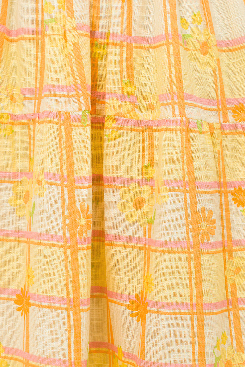 Perfect for a long lunch, the Sav Maxi Dress is made from a natural cotton cheesecloth fabric with our exclusive floral plaid print. It features a strapless straight neckline, shirred bodice, cutout at waist and a flouncy tiered ankle grazing skirt. Dress it up with the Lena Mules! Designed exclusively by Sabo.