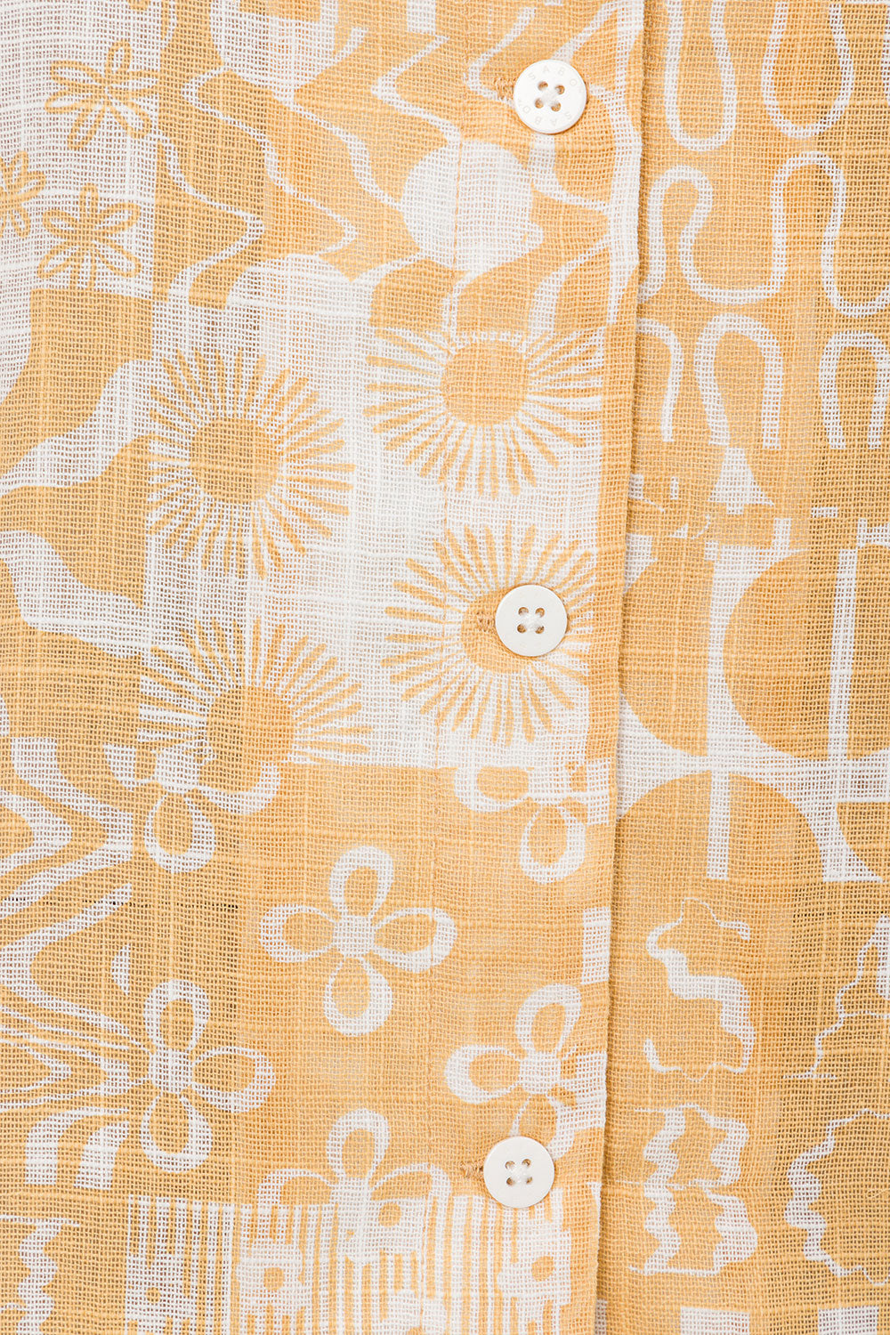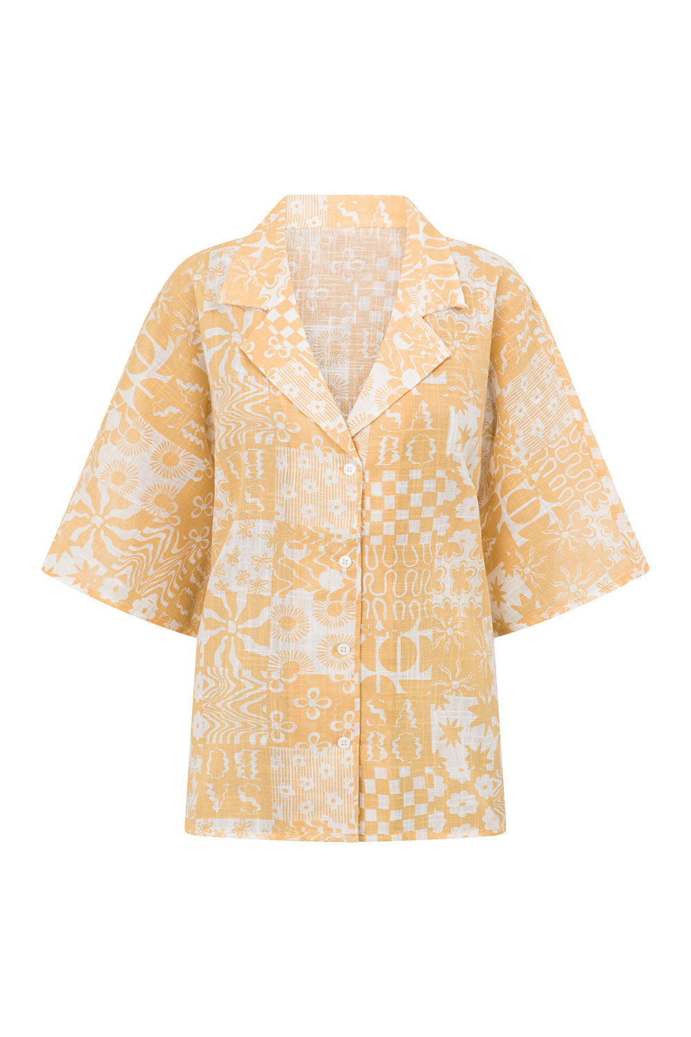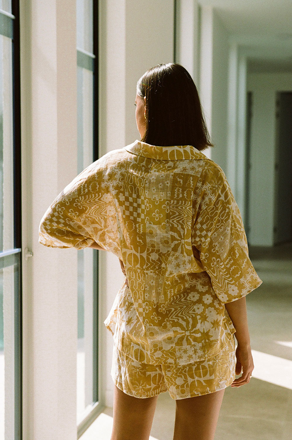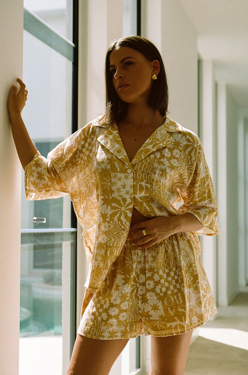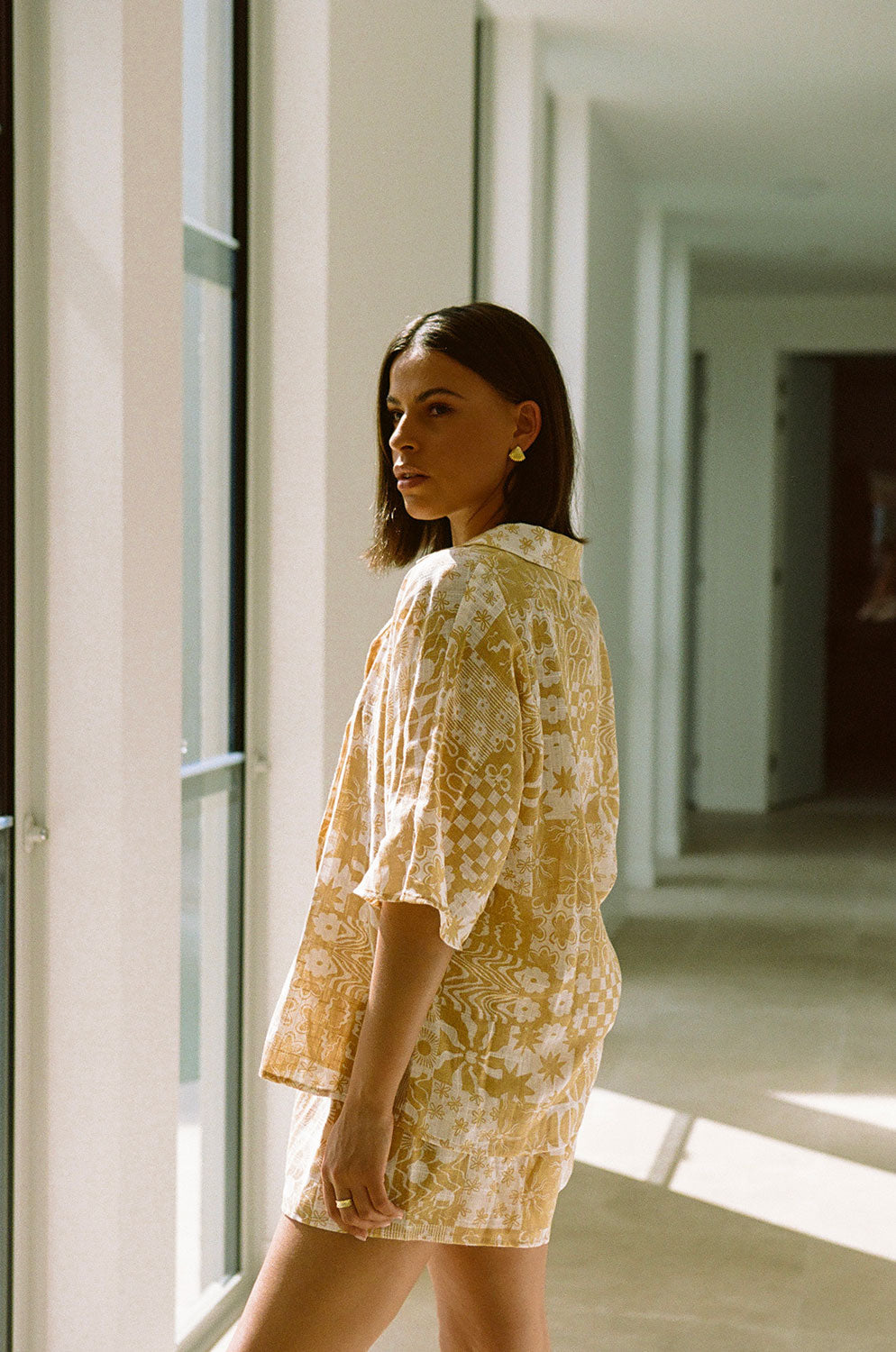 The perfect vacay outfit has arrived! The Seona Top is made from a natural cheesecloth cotton fabric in our exclusive tan canyon print. It is a relaxed style featuring 1/2 length sleeves, buttons down centre front and a low lapel collar. Keep the top open, pair with the Seona Shorts and throw over your bikinis! Designed exclusively by Sabo.