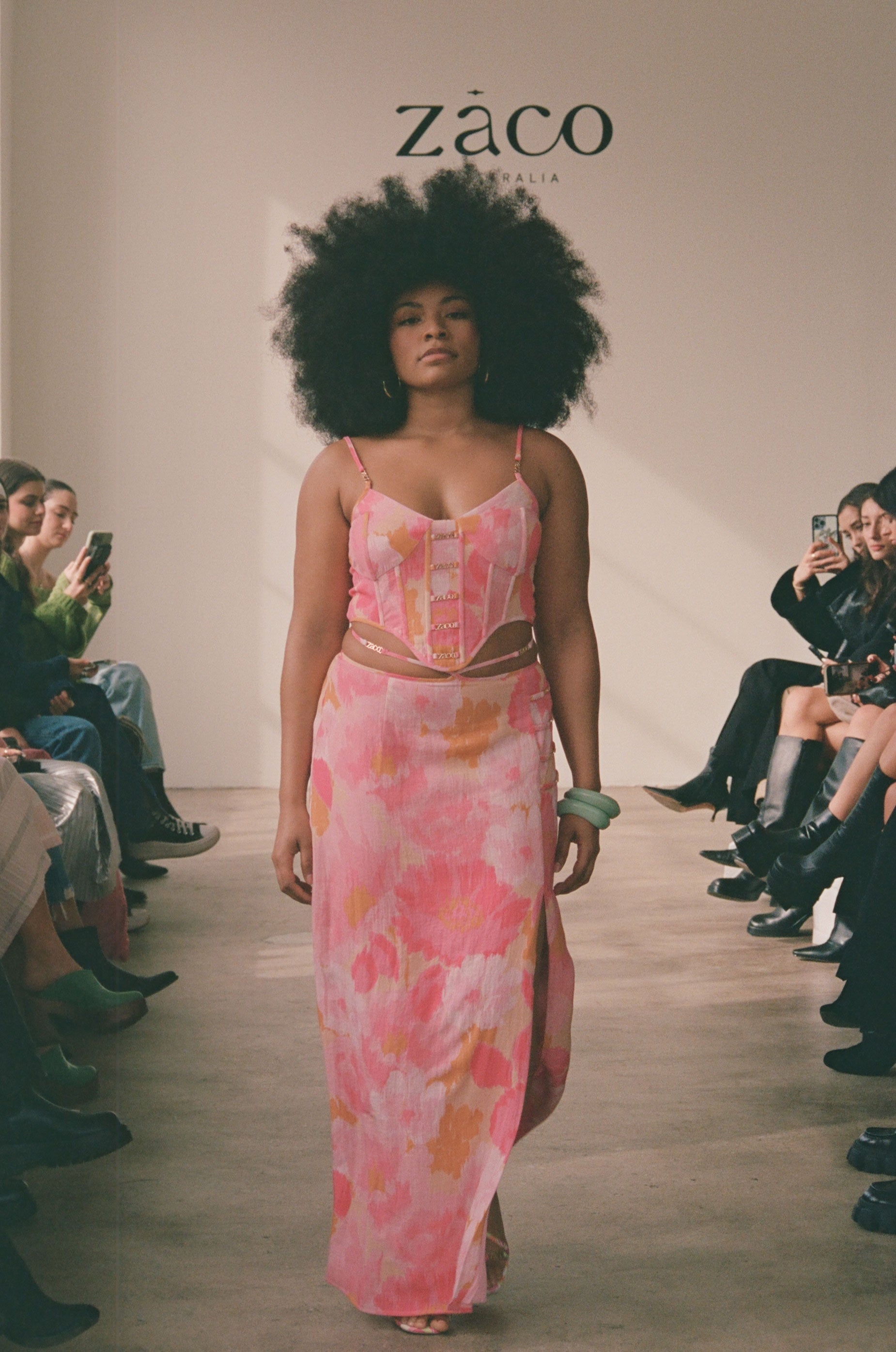 A piece that exudes feminine elegance and contemporary flair to make a bold statement for your next occasion! The Serralina Midi Skirt boasts our exclusive captivating pink gerbera print and features a flattering high waist with delicate bind and gold ZÃCO hardware at sides, bind strap gold ZÃCO hardware details at side hip, high split and ankle grazing length. Get the look with the Serralina Top! Exclusive ZÃCO design.