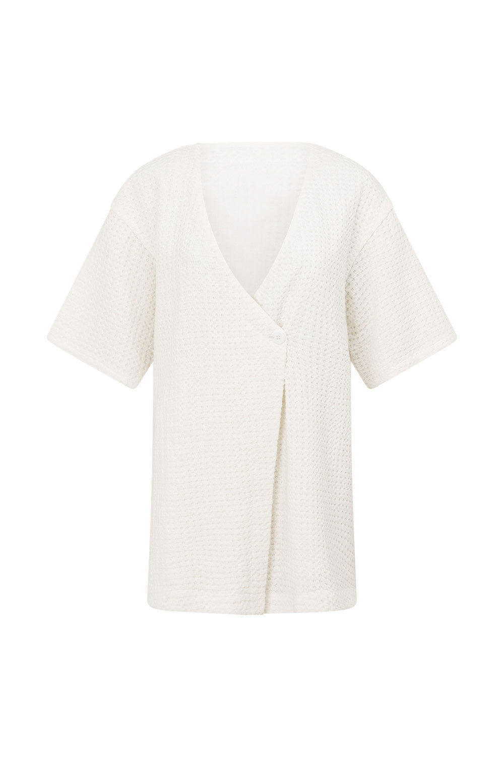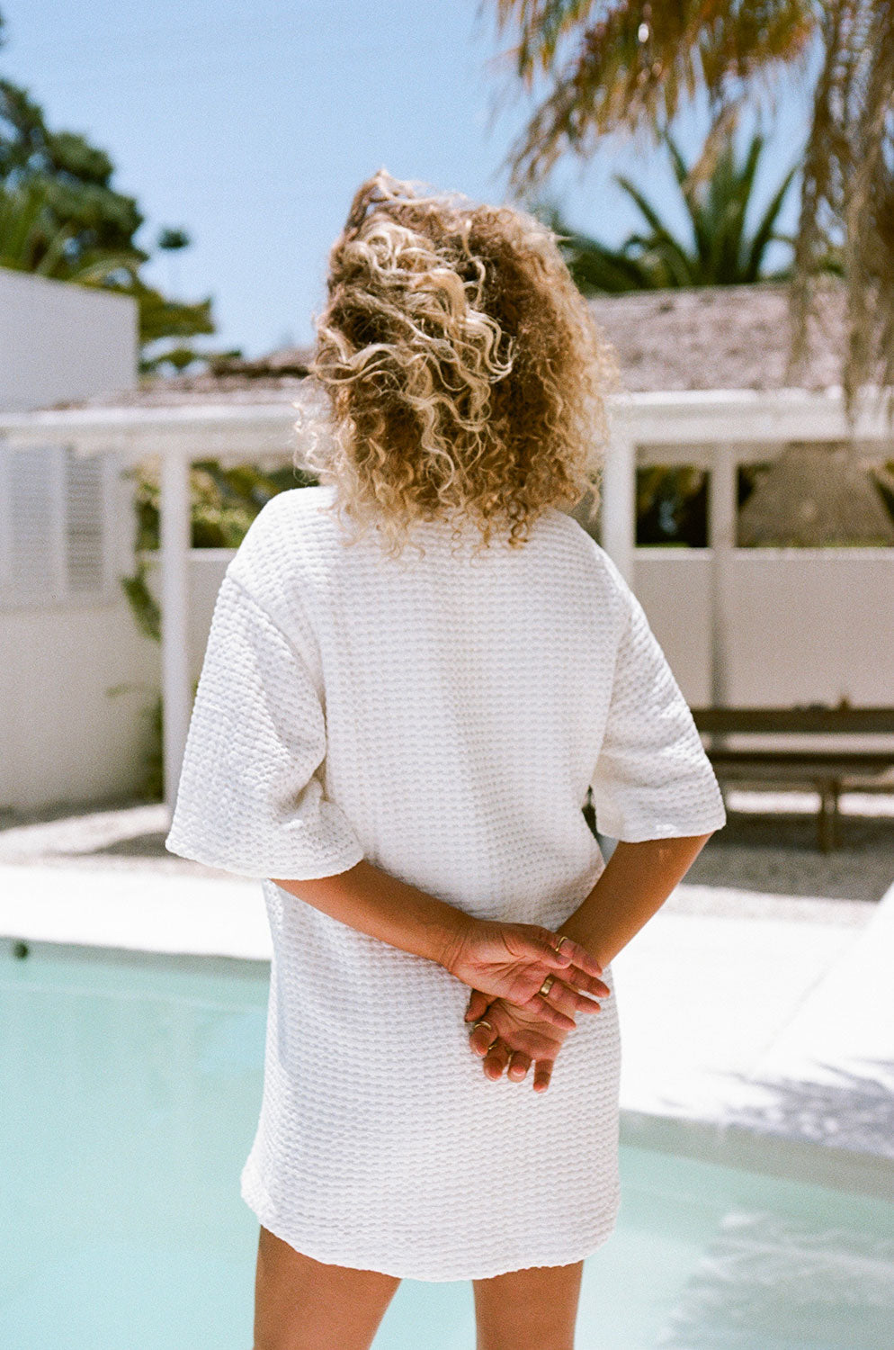 Throw it over your swimwear and pair it with slides for a cute vacation lunch outfit! The Shani Dress is made from a natural textured waffle cotton fabric in white. It features drop shoulders, 1/2 length sleeves, wrap style front with button closure and mini skirt. Designed exclusively by Sabo.
