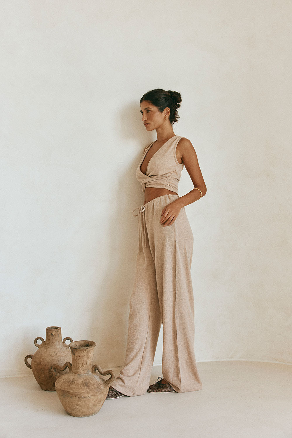 Style with heels and head to drinks with the girls! The Sierra Pants are made from a soft woven fabric in a tan hue. They are a high waisted style featuring a thin elasticated waist with drawstring and wide relaxed fit. Get the look with the Sierra Top! Designed exclusively by Sabo.