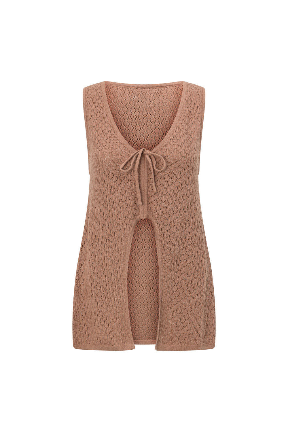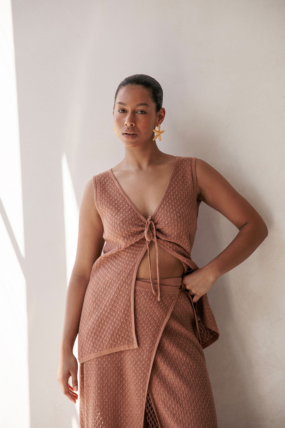Wear it as a set or style it with jeans! The Sonnet Top is made from a cotton blend pointelle knit in a tan hue. It is a relaxed style featuring tank sleeves, V neckline with draw detail, split at centre front and a longline hem. Get the set and pair with the Sonnet Skirt! Designed exclusively by Sabo.