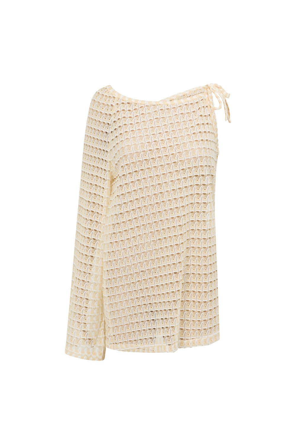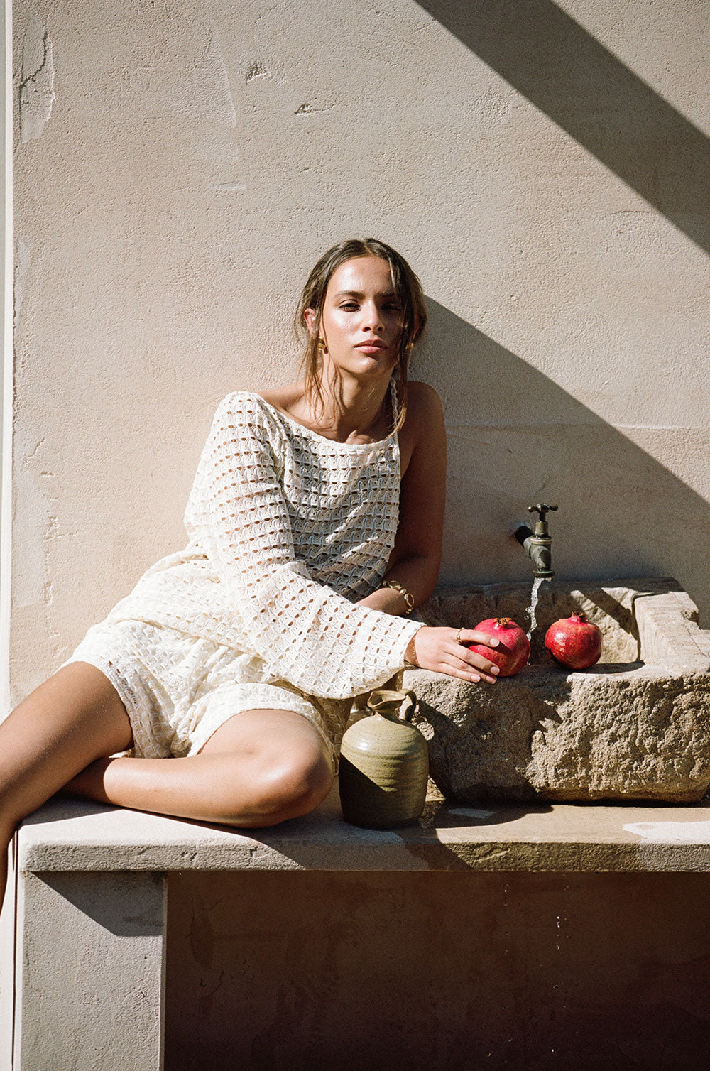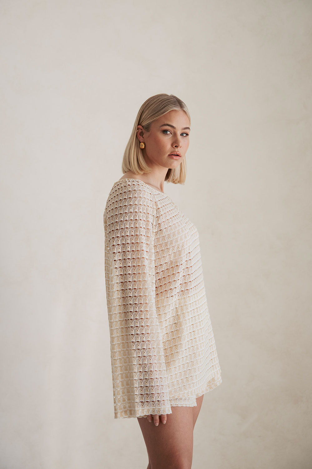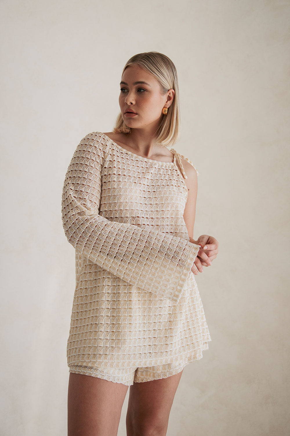 The perfect blend between vintage and resort, the Suka Top is made from a luscious jacquard knit in cream and white hues. It is a relaxed, unlined design featuring a single full length sleeve, bind shoulder tie and longline hem. Get the look and style with the Suka Shorts, a neutral bralette and sandals! Designed exclusively by Sabo.