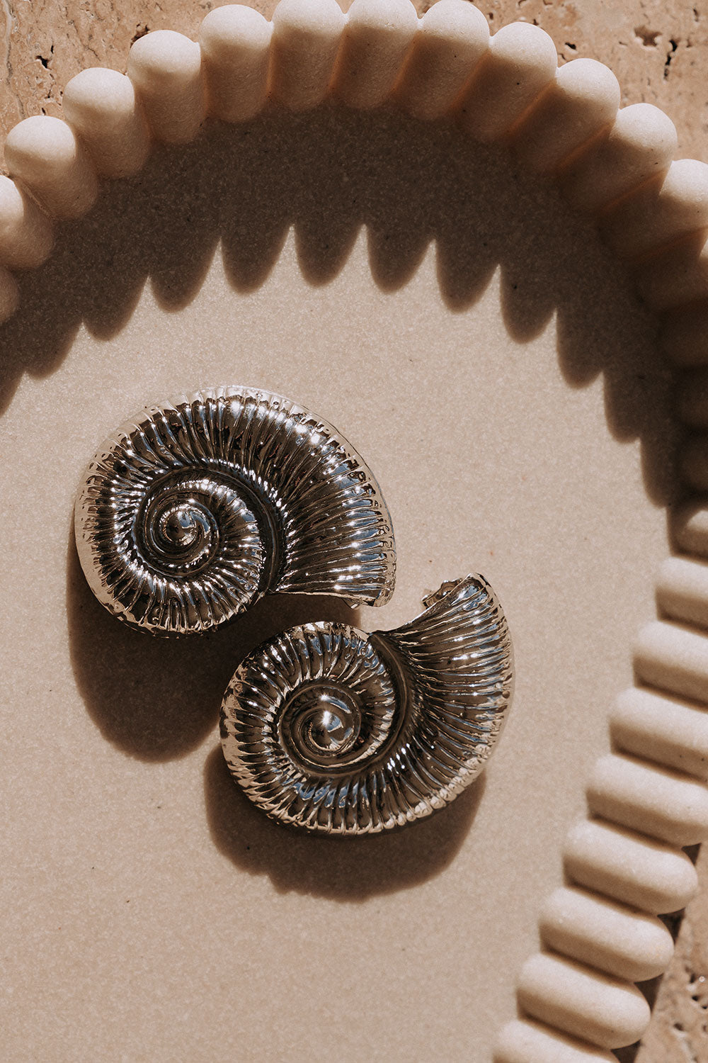 A fun and bold way to accessorise your look! The Sundial Earrings are silver toned and feature a large twirl shell with textured grooves throughout.