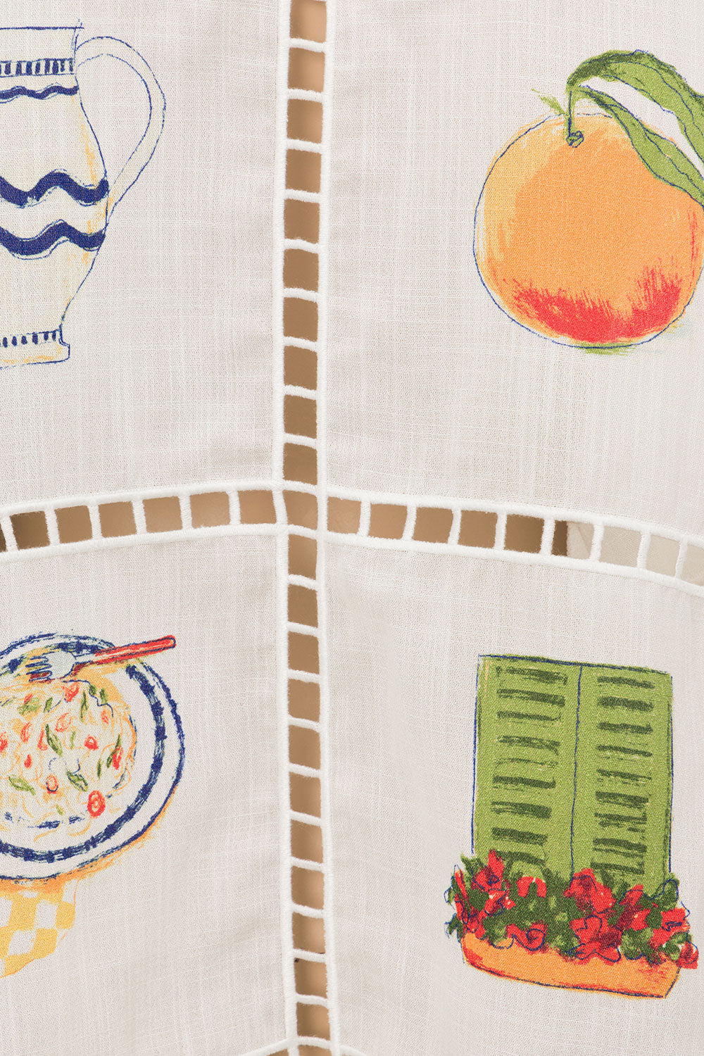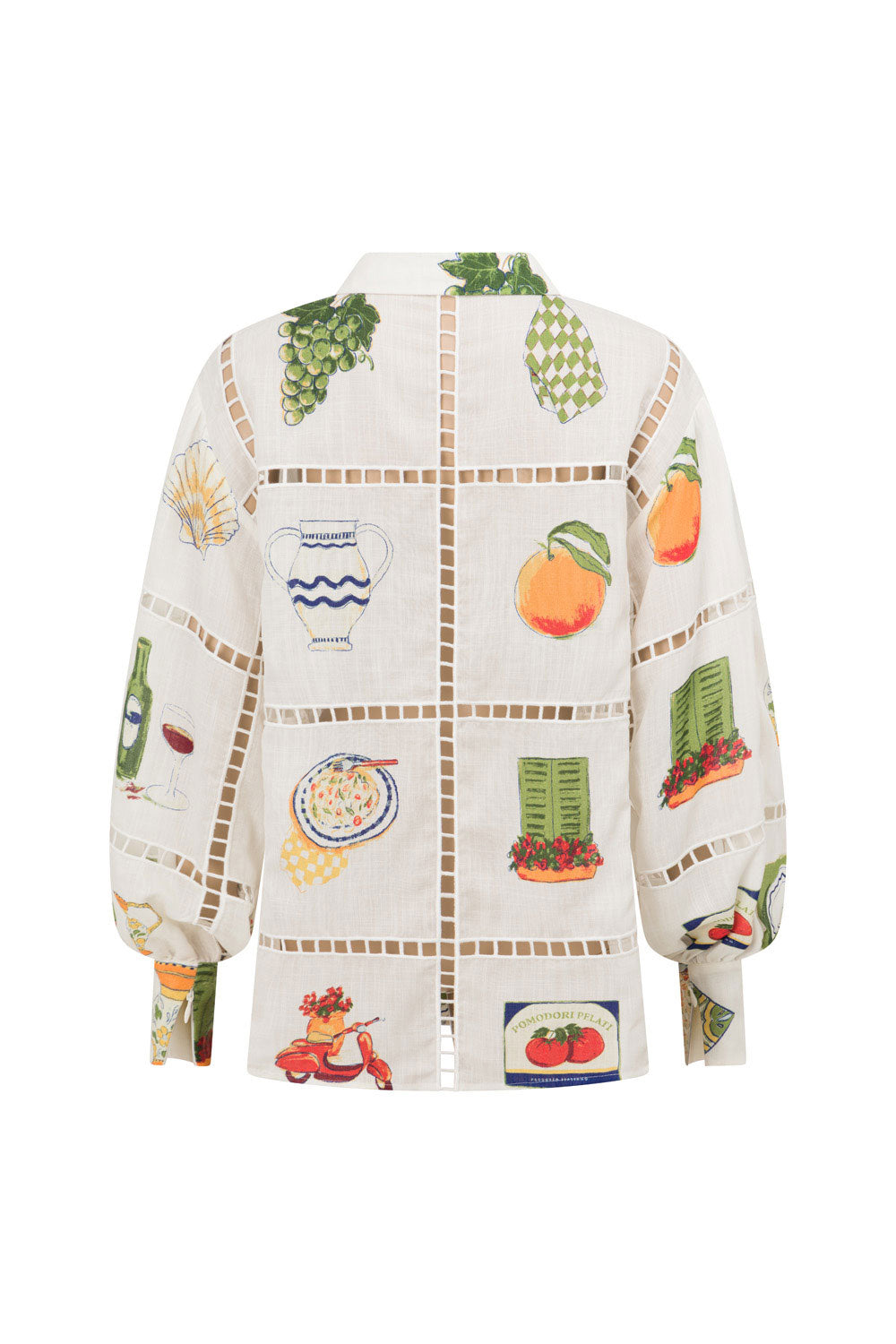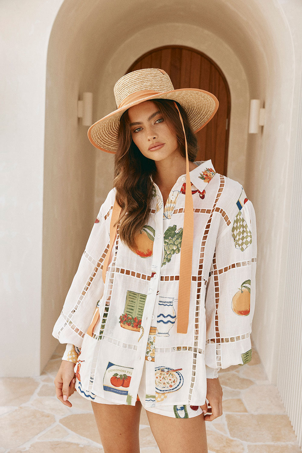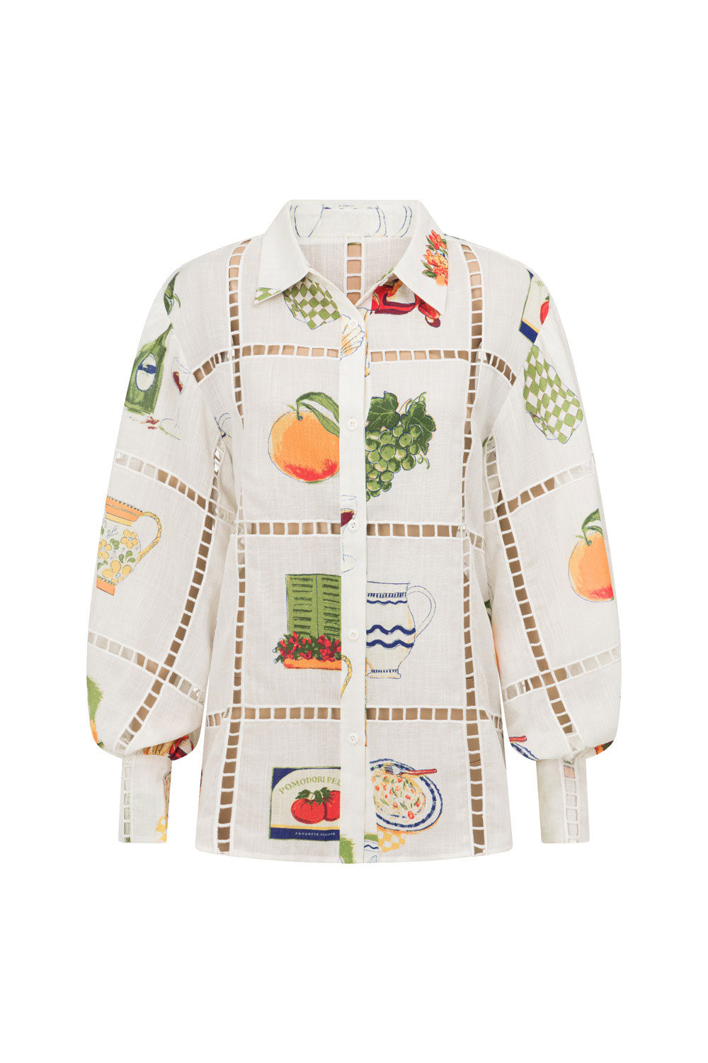 The Teramo Top in our exclusive Fattoria print from our Summer '24 collection. A viscose nylon blend boxy fit top with sheer ladder trims, billowing puff sleeves with fitted cuffs and buttons down front. Pair with the Teramo Shorts. Exclusive ZĀCO design.
