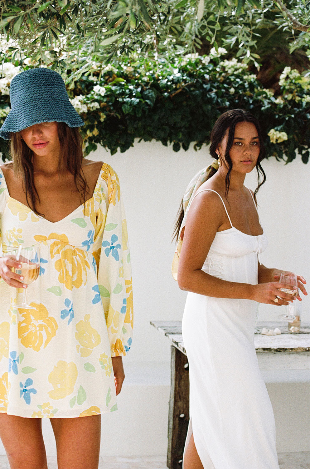 Dress it up with heels or keep it casual with sandals! The Tiami Babydoll Dress is made from a natural cotton seersucker fabric with our exclusive yellow garland print. It features full length puff sleeves, gathered waist and a flouncy mini skirt. Dress it up with the Strappy Livia Heels! Designed exclusively by Sabo.