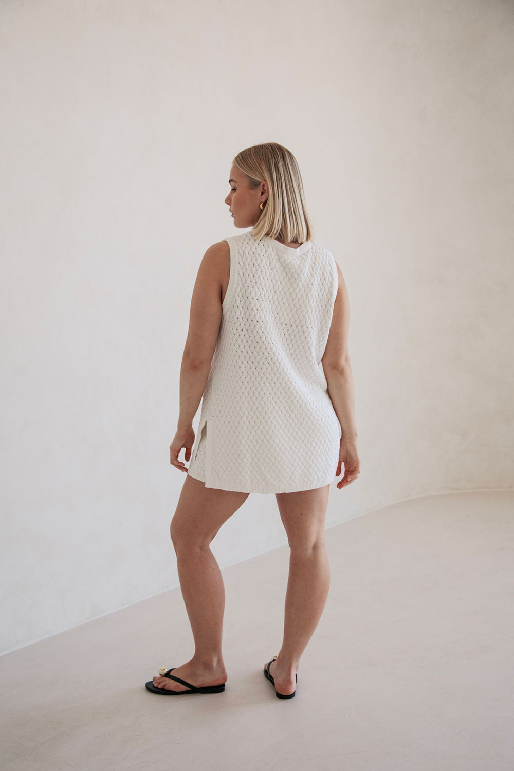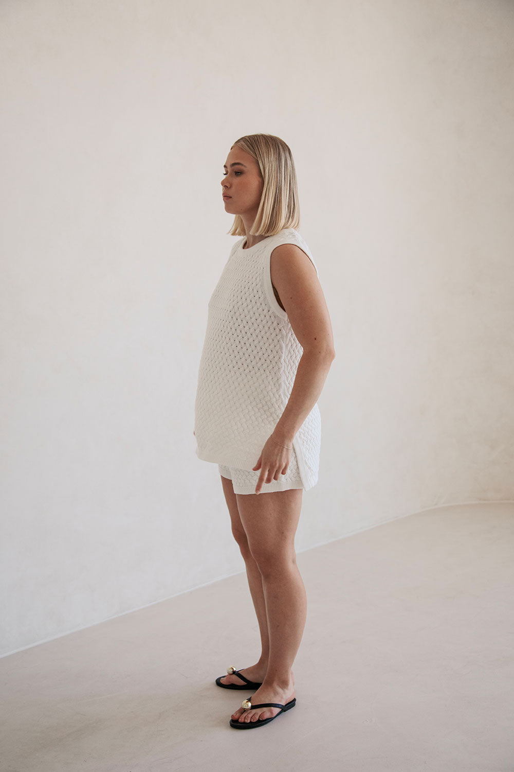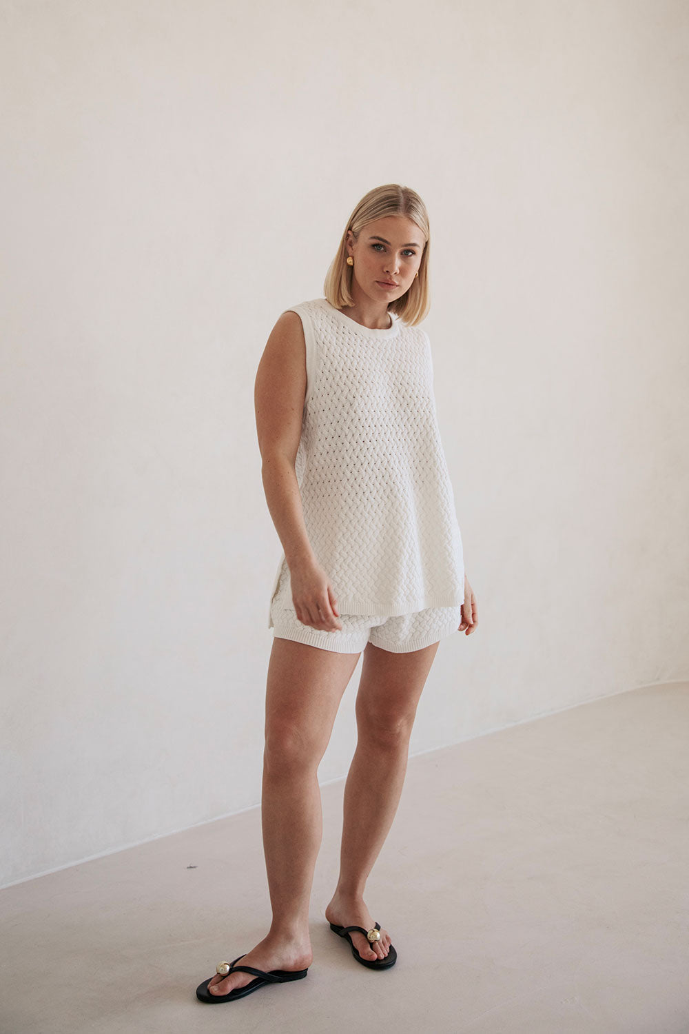 Wear it as a set or style it with relaxed jeans, the Winslet Top is made from a high quality textured cotton weave knit in an off white hue. It features ribbed trims and splits at sides. Get the look with the Winslet Shorts! Designed exclusively by Sabo.