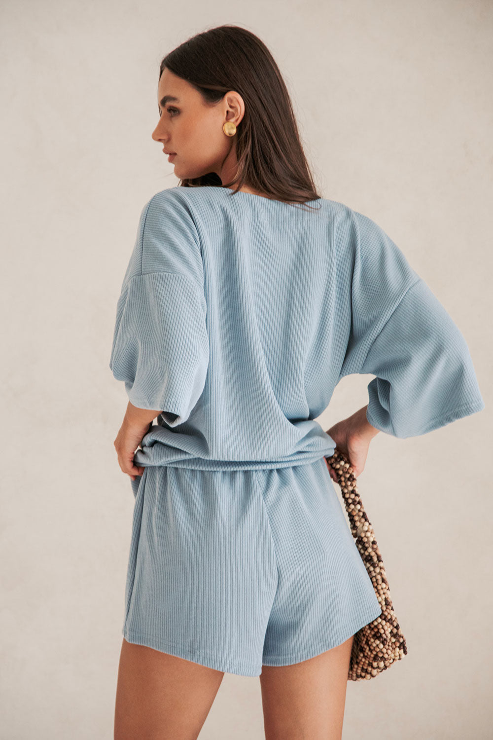 Comfy and chic, a go-to set you won't want to take off! The Wyatt Shorts are made from a stretchy knit rib fabric in a blue hue. They are a high waisted style featuring an elasticated waist with drawstring and high-low hems. Complete the look with the Wyatt Top and slides! Designed exclusively by Sabo.