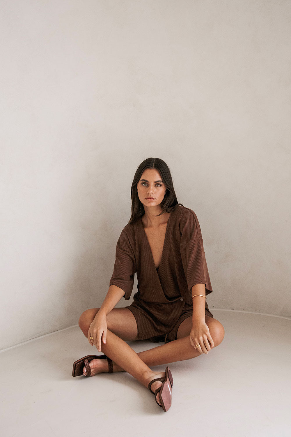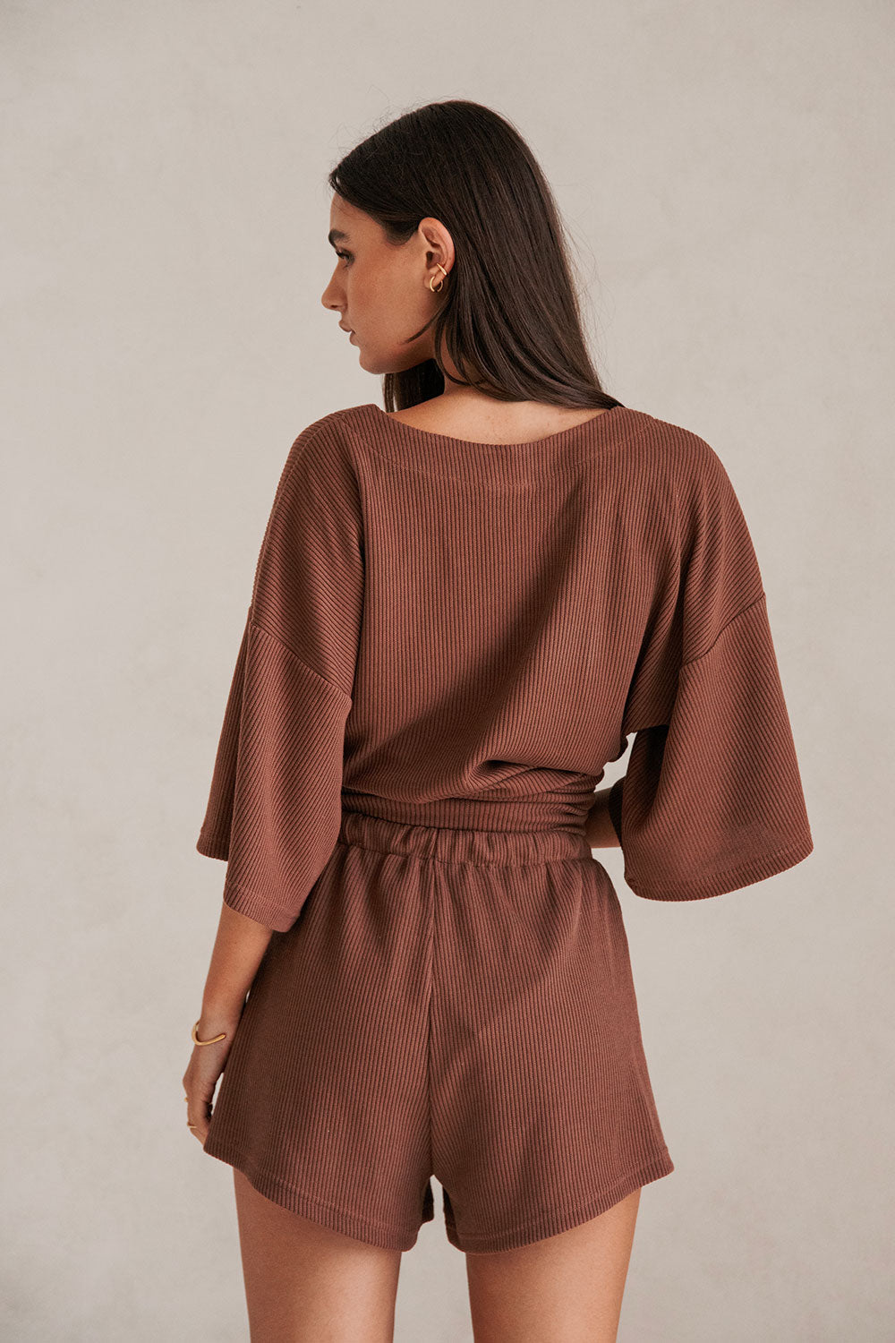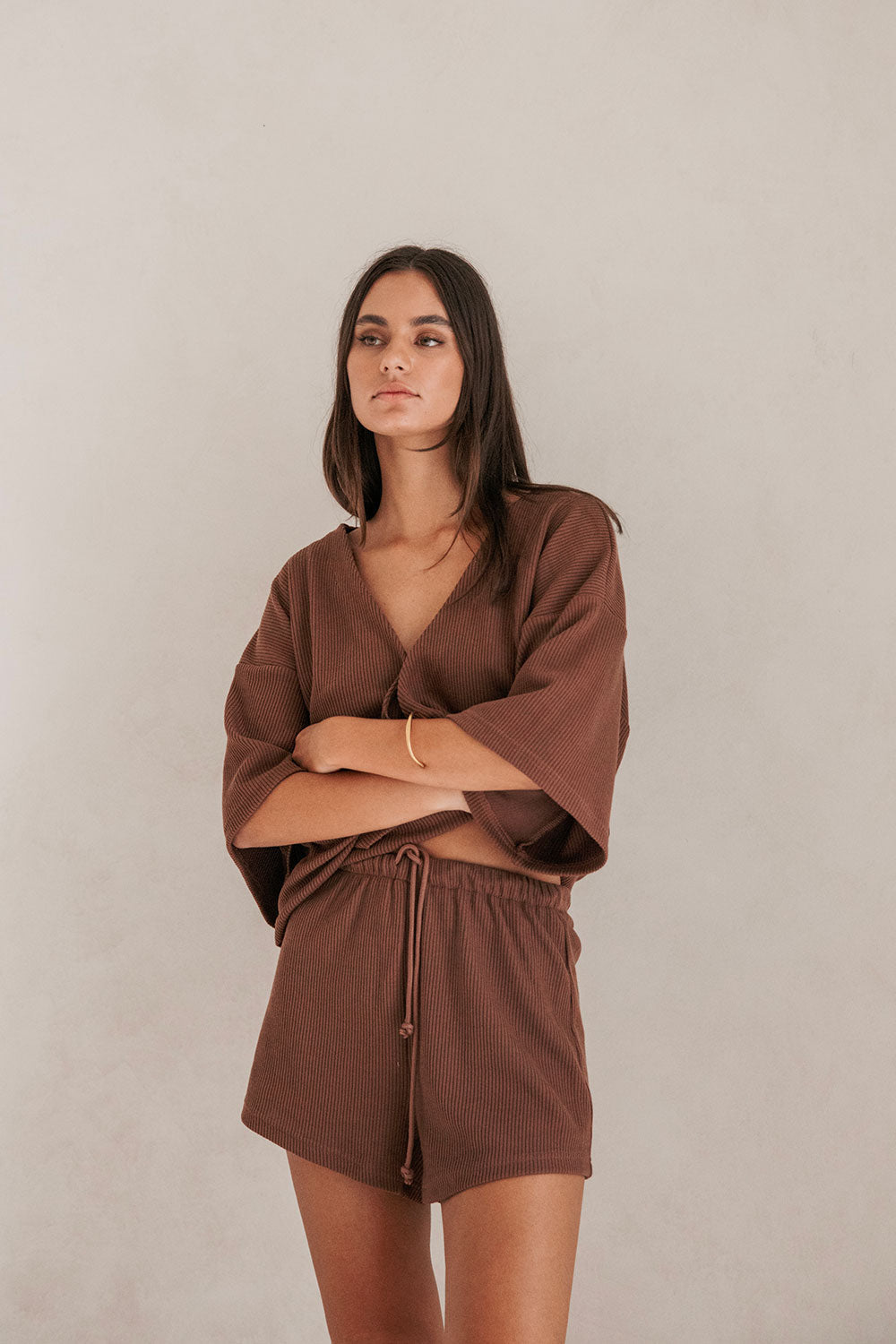 Comfy and chic, a go-to set you won't want to take off! The Wyatt Shorts are made from a lightweight knit rib fabric in a chocolate brown. They are a high waisted style featuring an elasticated waist with drawstring and high-low hems. Complete the look with the Wyatt Top and slides! Designed exclusively by Sabo.