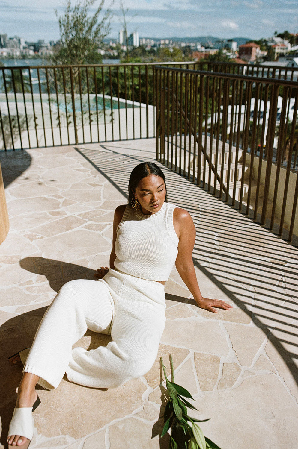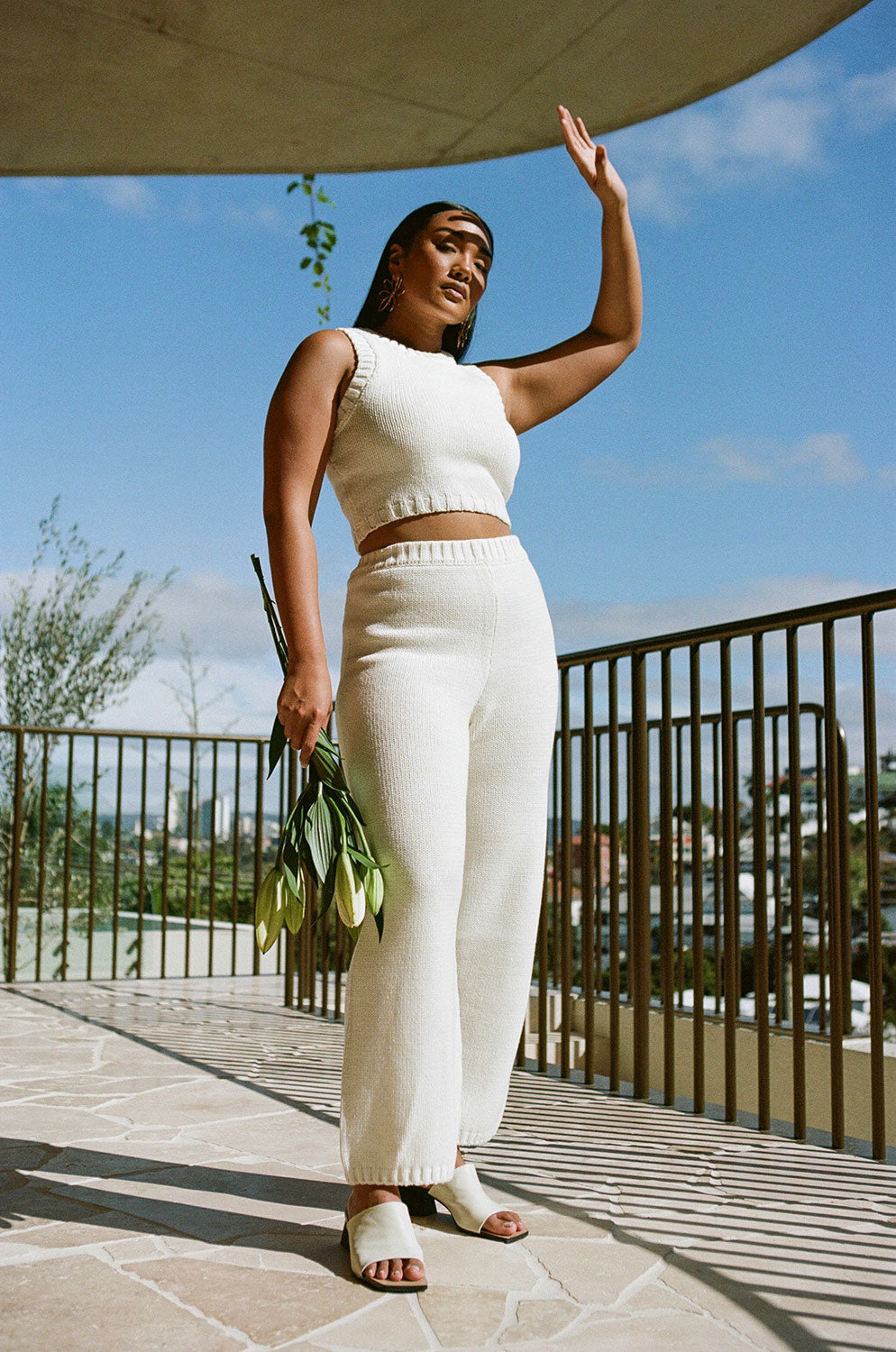 A stylish set for our neutral lovers! The Yukio Knit Pants are made from a cotton blend knit in white. They are a high waisted style featuring wide legs, elasticated waist and contrast rib trims. Pair with the Yukio Knit Top! Designed exclusively by Sabo.