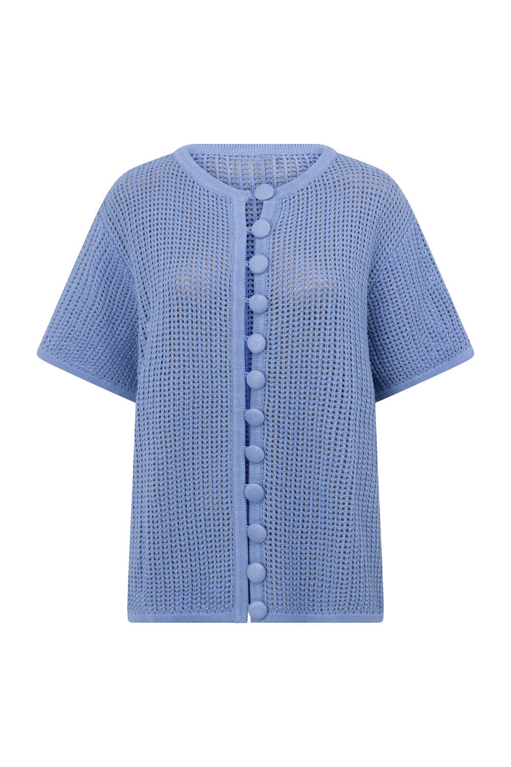 The vintage inspired Zayna Top is made from a loose crochet style knit fabric in a blue hue. It features large covered buttons down centre front, short boxy sleeves and a rounded neckline. Layer over a bralette and pair with the Zayna Pants! Designed exclusively by Sabo.