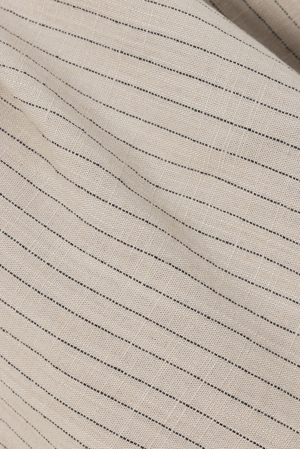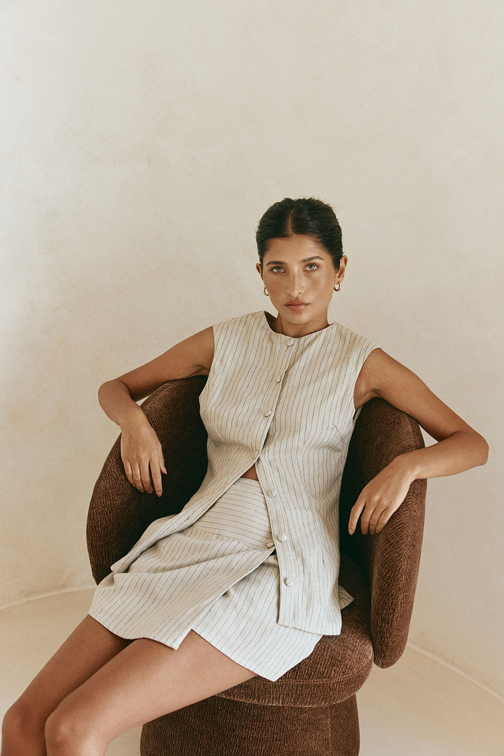 Made from a linen blend fabric in a stone hue. the Zinnie Skirt features pin stripes throughout, high waist, wrap panel at front with covered buttons at waist and an asymmetric hem. Get the set with the Zinnie Top! Designed exclusively by Sabo.