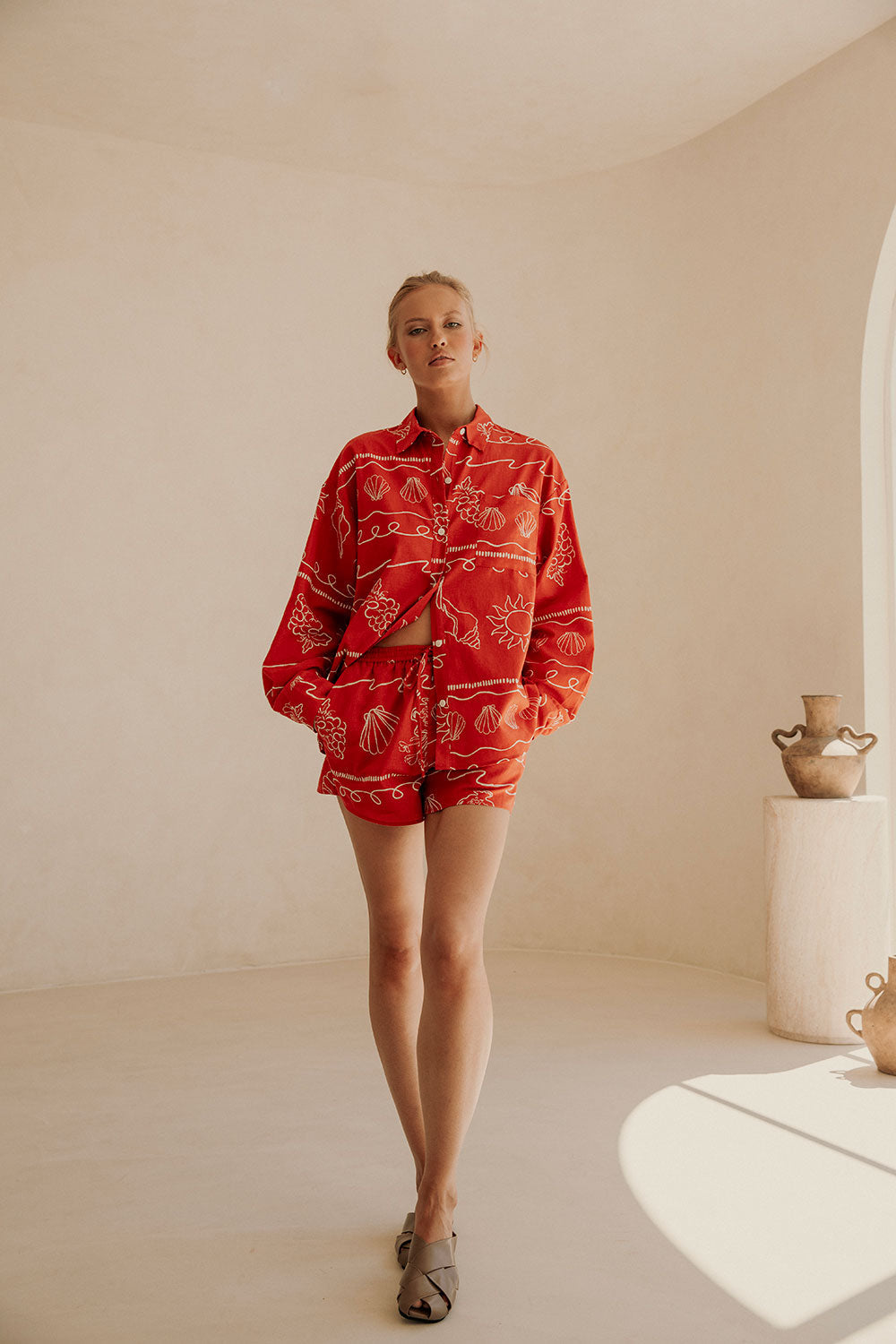 A structured basic with our fun exclusive print, the Zuli Top is made from a high quality linen cotton blend fabric and features drop shoulders, boxy full length sleeves, collar and buttons down centre front. Get the look with the Zuli Shorts or Ria Skirt! Designed exclusively by Sabo.